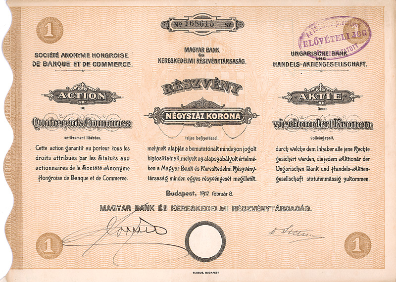 Gründung 1890 unter der Firma Ungarische Handels-AG, 1910 umbenannt in Ungarische Bank und Handels-AG, ab 1920 Britisch-Ungarische Bank AG, ab 1940 wieder Ungarische Bank und Handels-AG. Ursprünglich beschränkte sich die Ges. auf die Aus- und Einfuhrgeschäfte über Fiume und die Hebung des Verkehrs mit dem Orient. Das Aus- und Einfuhrgeschäft wurde allmählich eingeschränkt und schließlich 1926 gänzlich aufgelassen bei gleichzeitiger Ausweitung des Bankgeschäftes. 1927 wurde der Geschäftskreis auf die Pflege des Hypothekendarlehens- und Pfandbrief-Emissionsgeschäftes ausgedehnt. Dreisprachig französisch/ungarisch/deutsch. Originalsignaturen. Maße: 26,1 x 36 cm. Doppelblatt, mit Kupons, nicht entwertet. Sehr günstig angebotenes Papier der überaus bedeutenden Bank!