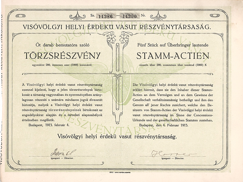 Gründung am 4.11.1912. Strecke von Visóvölgy nach Borsa, knapp 60 km lang. 1915 beförderte die Bahn knapp 100.000 Fahrgäste. Zweisprachig ungarisch/deutsch. Originalsignaturen. Maße: 24,8 x 32,8 cm. Mit komplett anhängendem Kuponbogen.