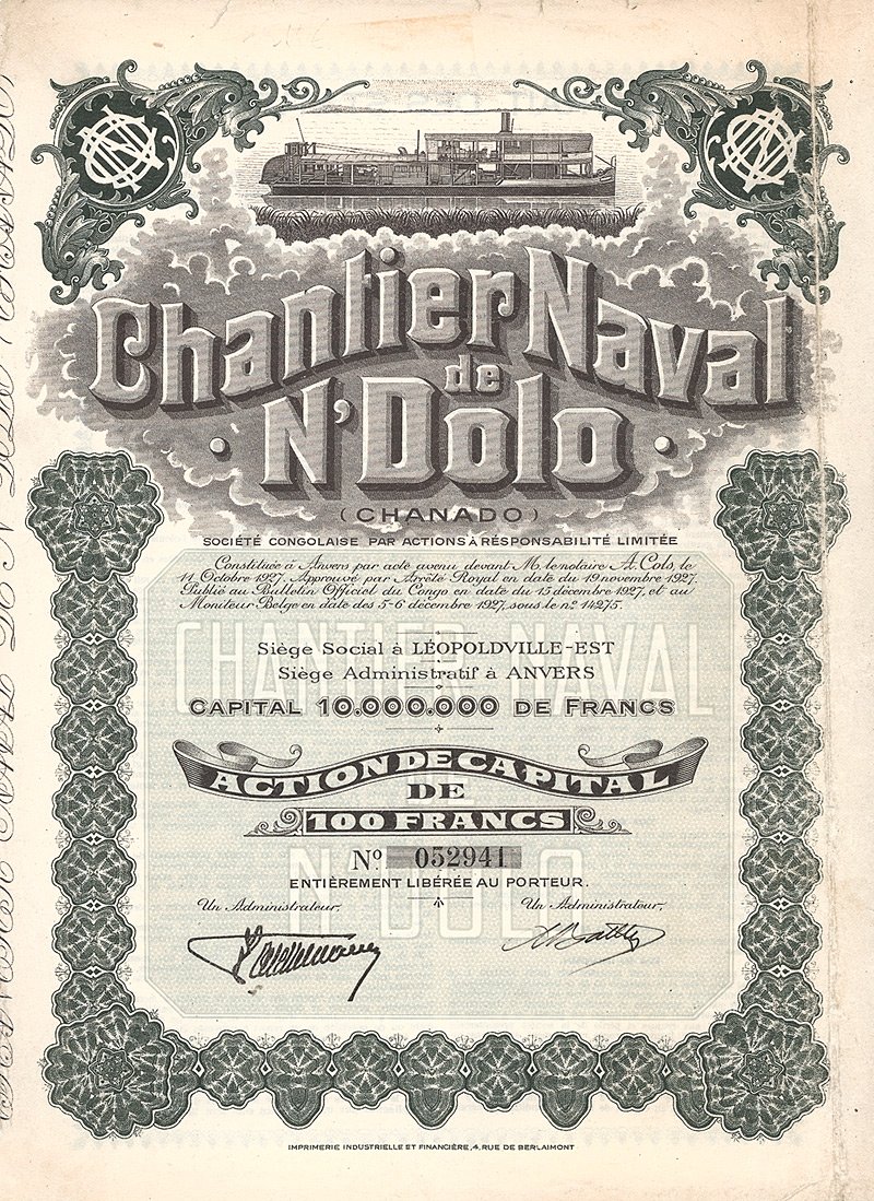 Gegründet 1927 von dem belgischen Industriellen Pierre Verbeek in Kinshasa zwecks Betrieb einer Schiffswerft in Ost-Léopoldville, Ankauf, Verkauf und Reparatur von Schiffen. Dekorative Kolonialaktie aus Belgisch-Kongo, seit der Berliner Kongokonferenz 1885 Privatbesitz des belgischen Königs Leopold II. Vignette mit Abbildung eines Kongo-Dampfers. Maße: 33 x 24 cm. Rückseitig Statuten. Mit komplett anhängenden Kupons.