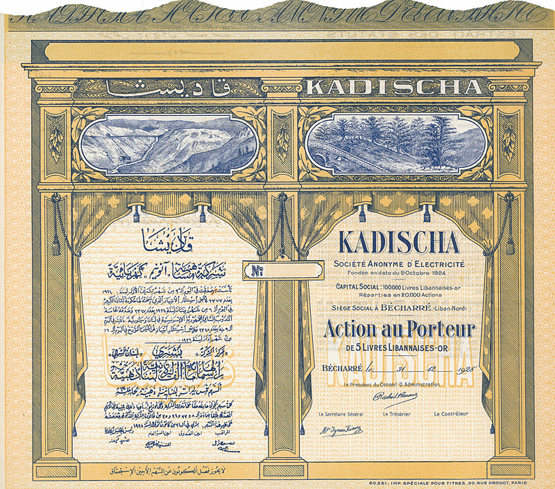 Gegründet 1924 zur Ausnutzung der Wasserkräfte in den bis auf über 3.000 m aufragenden Gebirgszügen im Nordlibanon. Zweisprachig arabisch/französisch. Zwei schöne Vignetten mit Wasserkraftwerk und Olivenhain. Maße: 22,6 x 25,9 cm. Mit anhängendem Kuponbogen.
