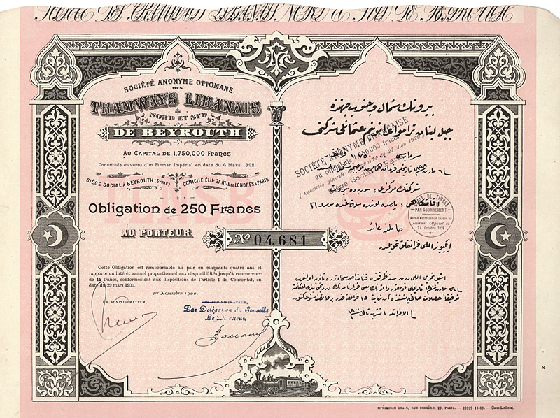 Konzessioniert 1896 für den Betrieb der Straßenbahnen in der heutigen libanesischen Hauptstadt Beirut (gehörte damals zum Ottomanischen Reich). 1906 übernahm die neugegründete “S.A. Ottomane des Tramways et de l’Electricité de Beyrouth” die Geschäfte. Schöne Ornament-Umrahmung, kleine Eisenbahn-Vignette, Text zweisprachig französisch/osmanisch. Maße: 23,8 x 32,3 cm. Mit anhängenden restlichen Kupons. Knickfalten, sonst tadellose Erhaltung.