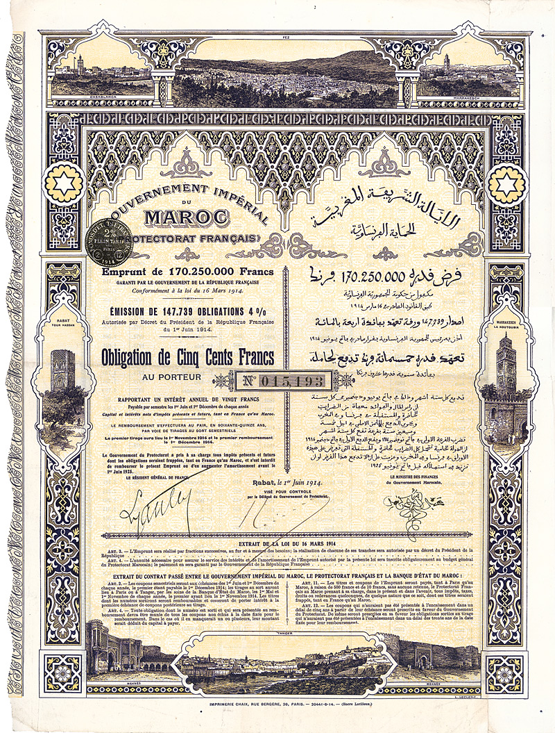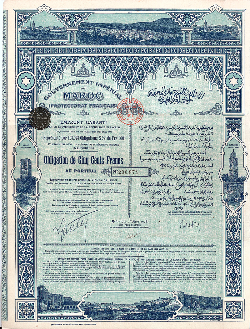Durch die Verträge, die Frankreichs 1912 mit dem Sultan und mit Spanien schloß, wurde Marokko in ein französisches (Hauptstadt Rabat) und ein spanisches Protektorat (Hauptstadt Tetuán) aufgeteilt. Erst 1956 erlangte das Land seine Unabhängigkeit. Zweisprachig französisch/arabisch. Hochdekoratives Papier mit mehreren Ansichten von Casablanca, Marrakesch, Rabat und Meknes, umgeben von orientalischen Verzierungen. Die künstlerische Gestaltung stammt von L. Leclerc. Léon Leclerc, Landschafts- und Marinemaler, stellte 1890-1903 im Salon der Pariser Soc. d. Art. franc. aus. Maße: 44,4 x 33,6 cm. Mit anhängenden restlichen Kupons ab 1948, keine Entwertung.