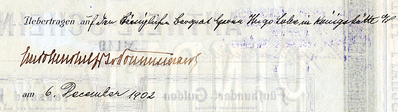 Ausgestellt auf und rückseitig original unterschrieben von Graf Guido Henckel-Donnersmarck (1830-1916). Der junge Graf aus schlesischem Uradel wuchs in einem von Wohlstand und Prunk geprägten Umfeld auf. Noch nicht einmal die Berliner Bankiers oder die Mitglieder des Kaiserhauses führten einen solchen aufwendigen Lebenswandel wie die schlesischen Magnaten. Lebensweg und Karriere des Grafen sind schillernd, aber auch erfolgsgeprägt und nur vor diesem Hintergrund zu verstehen. Graf Guido Henckel-Donnersmarck wurde von seinem Vater zu seinem 18. Geburtstag zu einem der reichsten Männer Europas gemacht. Durch Macht und Luxus seiner Familie herrisch und verwöhnt geworden, zudem gutaussehend, verließ er das “stinkende Revier” und zog nach Paris, wo er wie viele andere müßiggehende Adlige aus allen möglichen Ländern den ausschweifenden Lebenswandel eines Playboys führte. Er gab das Geld mit vollen Händen aus, war in den Salons und Spielcasinos, den Rennbahnen und Ganovenkneipen, den literarischen Zirkeln und der Oper zu Hause. Seine finanzielle Lage verschlechterte sich dadurch zusehends. Als der Graf die Marquise Therese Araujo de Pavia, eine Pariser Lebedame, zu seiner Freundin machte und beschloß sie zu heiraten, war das monatelang Stadtgespräch der Pariser Lebewelt. Doch die Unkenrufe kamen zu früh: Die Pavia entpuppte sich als geschäftstüchtige Frau und hatte durchaus den Ehrgeiz, dem Lotterleben des Grafen ein Ende zu setzen - was ihr auch gelang. Graf Guido entwickelte sich zu einem Industriemagnaten ersten Ranges. Die vom Vater geerbte Laurahütte verschmolz er mit der bis dahin staatlichen Königshütte zur Vereinigten Königs- und Laurahütte. Zur besseren Beherrschung des Marktes gründete er die Schlesische AG für Bergbau und Zinkhüttenbetrieb, in der seine französischen Verbindungen besonders wirkungsvoll zum Tragen kamen. Kurzum, er begründete den Ruf der legendären schlesischen “Fürstenkonzerne”. Um 1880 wurde in Oberschlesien soviel Zink gewonnen wie im ganzen Rest der Welt zusammen. Der Ruf des Grafen als geschickter und weitblickender Geschäftsmann war so groß, dass ihn Bismarck im Jahr 1871 neben seinem Hausbankier Bleichroeder als einzigen deutschen Industriellen als Berater zu den Verhandlungen über die französischen Reparationszahlungen beorderte. Später wurde der Graf vom Kaiser in den Fürstenstand erhoben. 1896 erwarb Donnersmarck umfangreiche Ländereien im ungarischen Zipser Gebiet, beteiligte sich an der Commandit-Gesellschaft Pinder & Co. und 1897 an der Erschließung weiterer Kohlegruben im Grenzbezirk Bendszin, kaufte Bergwerke in Schweden und gründete 1898 anlässlich seines 50. Geburtstages zur Unterstützung seiner Angestellten die nach im benannte “Guido-Stiftung”. Er bekleidete Aufsichtsratsposten u.a. bei der A.E.G. und der Dresdner Bank und galt, als er 1916 86jährig starb, neben Alfred Krupp mit einem Vermögen von ca. 300 Mio. Mark als der reichste Mann im Deutschen Reich. Mit zwei runden Vignetten. 1903 wurde der Name der Firma geändert in Mantzke & Co. Maße: 26,5 x 31,6 cm. Eine industriegeschichtlich hochbedeutende Rarität und ein außergwöhnlicher Autograph!