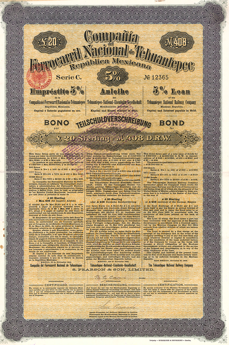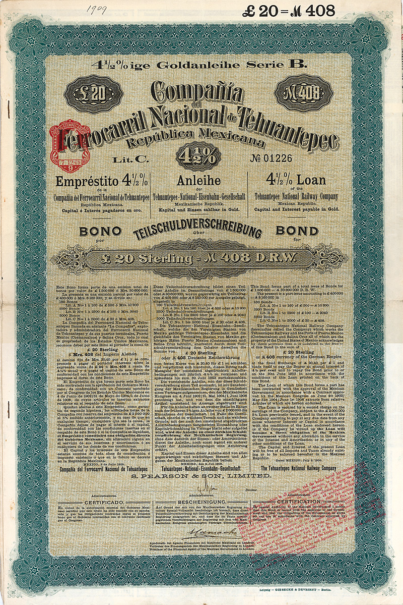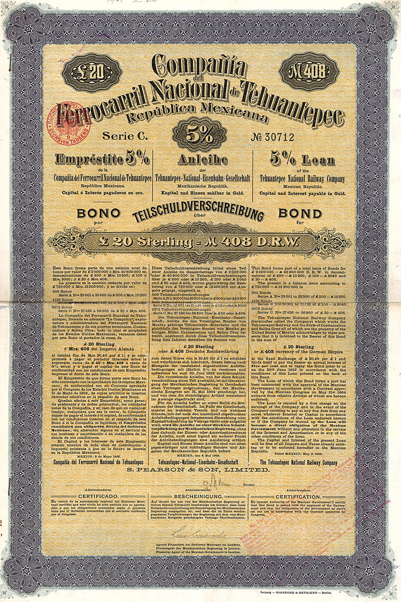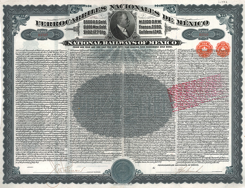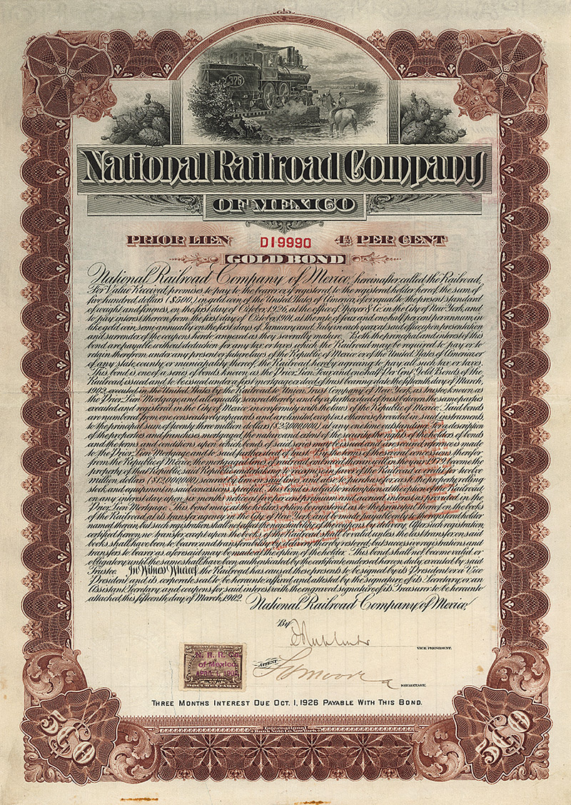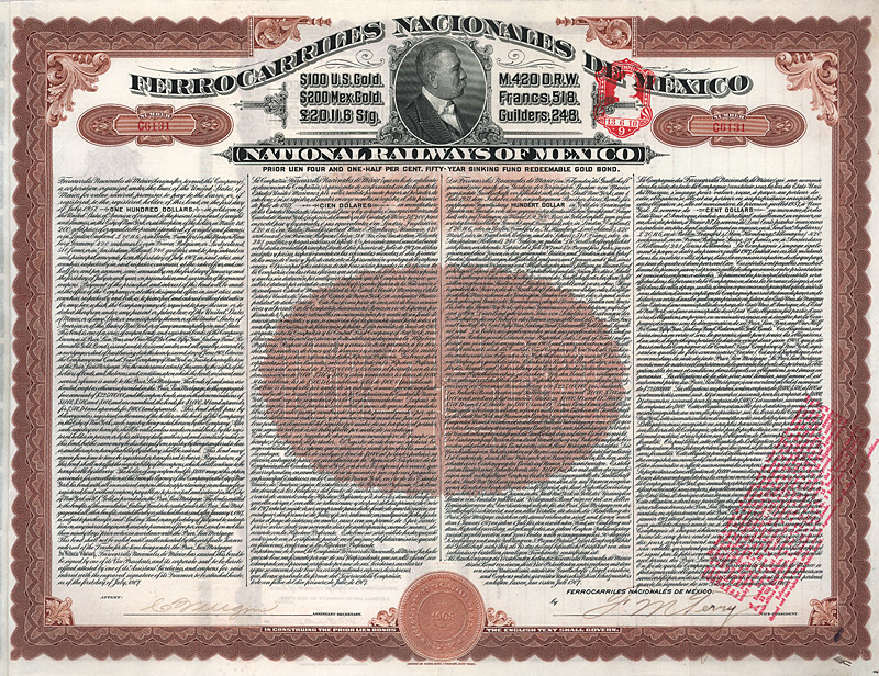 Die Gesellschaft entstand 1908 aus der Verschmelzung der Mexican Central Railway Co. mit der National Railroad Co. of Mexico. An dieser Gründung waren u.a. die Bank für Handel und Industrie, Darmstadt und die Berliner Handels-Gesellschaft, Berlin beteiligt. Die neue Gesellschaft verfügte nun über ein Streckennetz von über 5000 Meilen Länge. Prior Lien waren Darlehen an erster Rangstelle. Fifty year sinking redeemable Gold Bond, rückzahlbar 1957. Großformatig. Mit Portait-Vignette des mexikanischen Präsidenten. Original signiert von dem Vizepräsidenten der Gesellschaft. Maße: 33,5 x 44,5 cm. Nicht entwertet und mit beiliegendem Kuponbogen (Kupons ab 1928 #41 bis #100) + Warrants. Nicht entwertet!