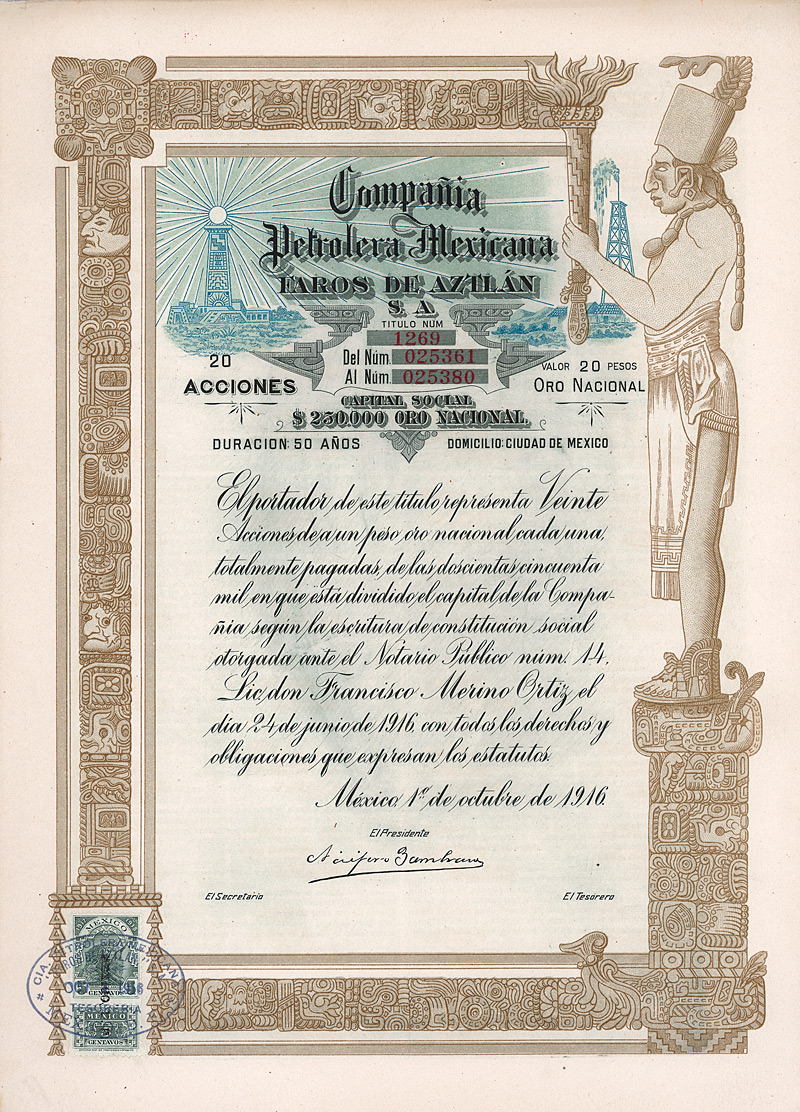 Hochdekoratives Papier mit vielen Motiven: Hohepriester des Azteken-Kriegsgottes Huitzilopochtli, Pyramide, sprudelnde Ölquellen, Azteken-Bilderschrift. Maße: 33,8 x 24,4 cm. Rückseitig Statuten. Mit komplett anhängenden Kupons.