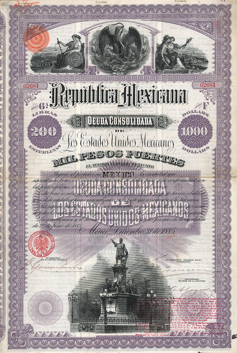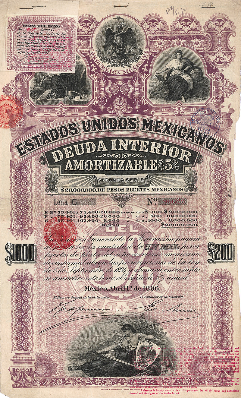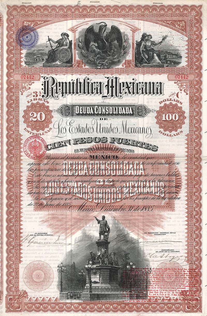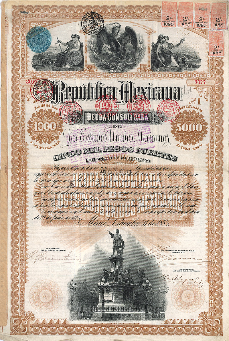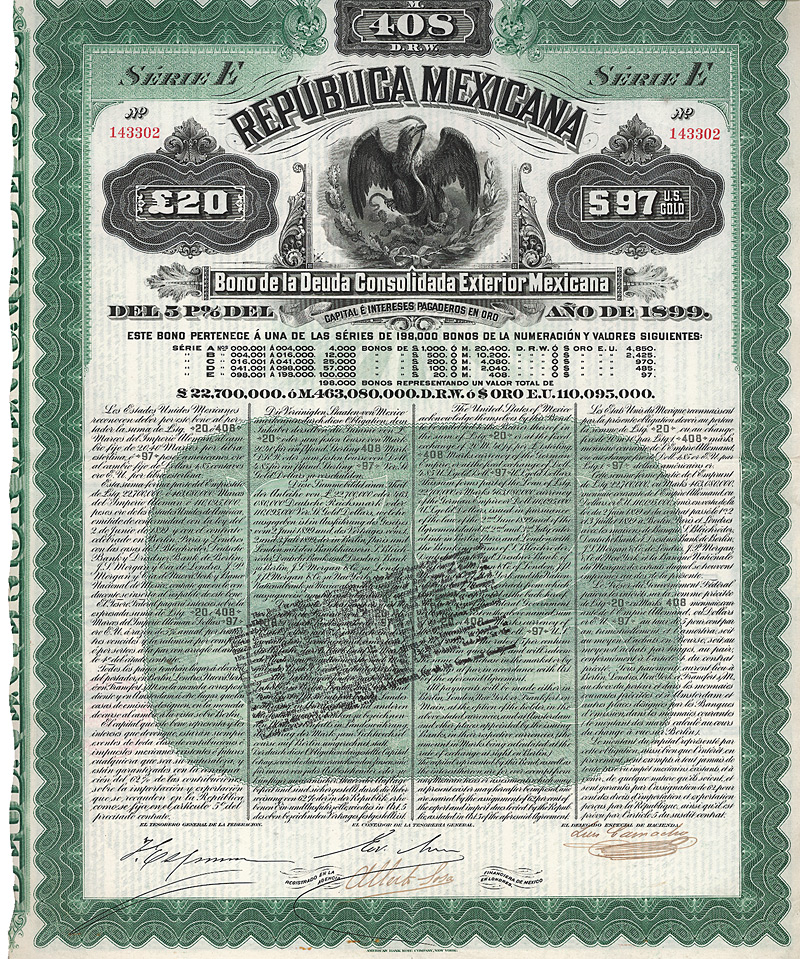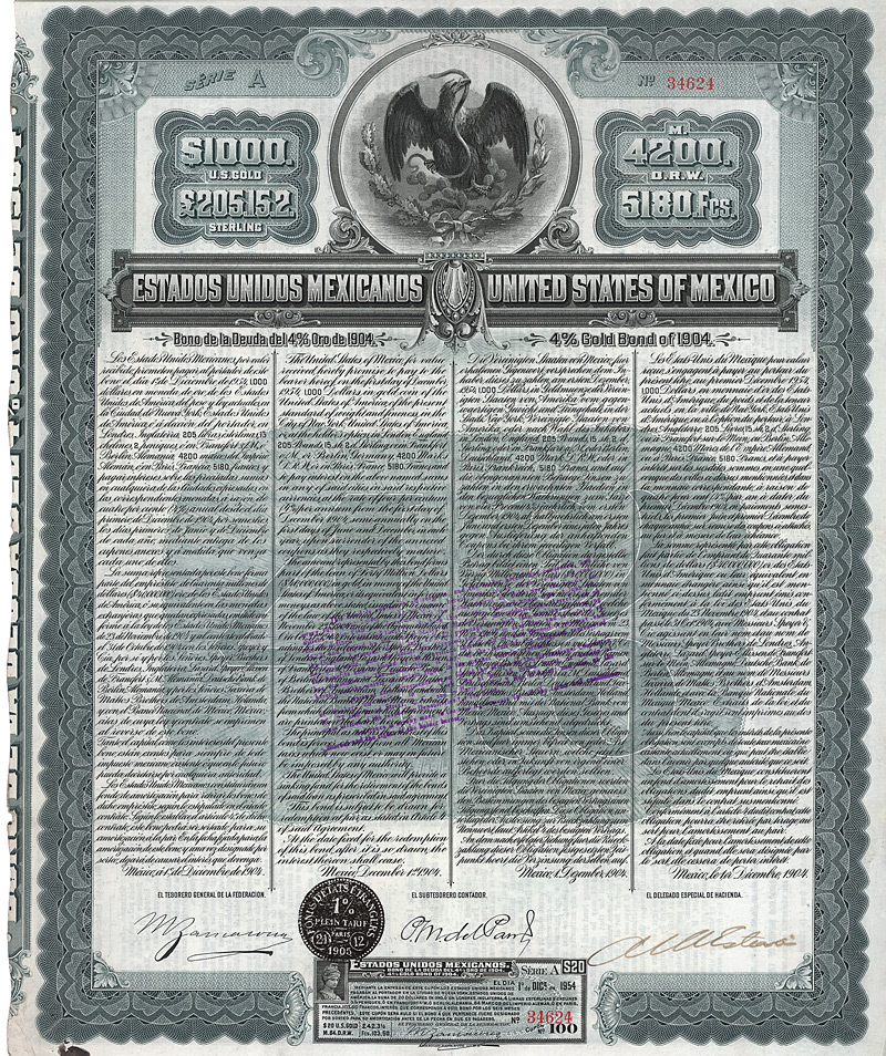 Auflage 35.000. Viersprachig spanisch/englisch/ deutsch/französisch. Stahlstich der ABNC, großes Wappen mit Adler und Schlange. Maße: 37,8 x 30,4 cm. Mit anhängenden restlichen Kupons ab 1928 (#47-100) + Warrants + Steuerausweis des Deutschen Reiches. Wurde im letzten Jahr spekulativ zu Preisen zwischen 500 Euro und 20.000 Euro gehandelt (angeblich mehrere Millionen USD wert). Nicht entwertet!
