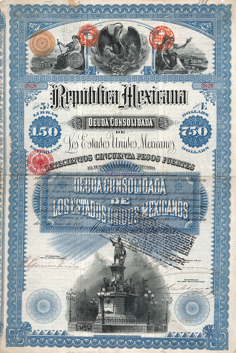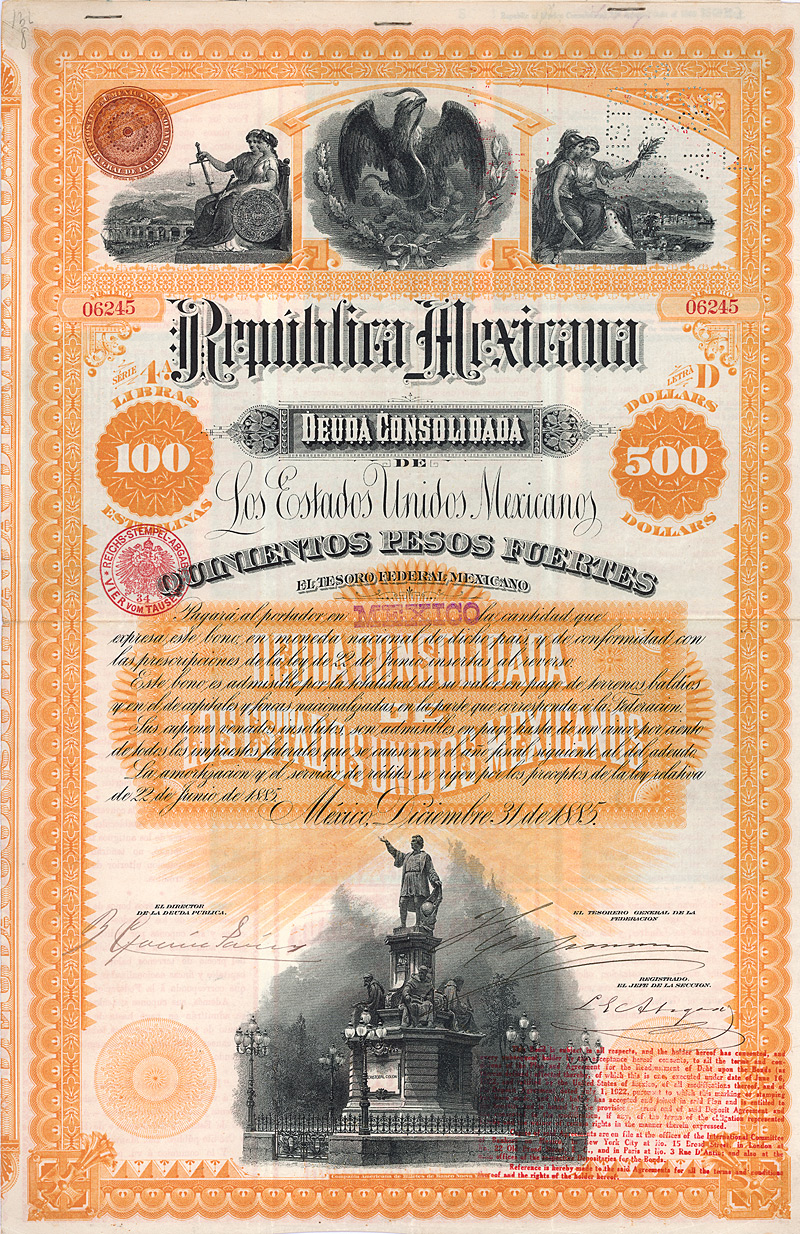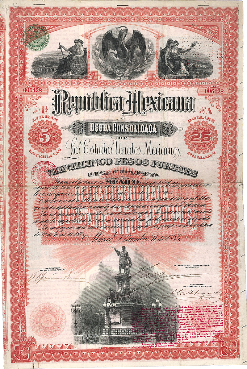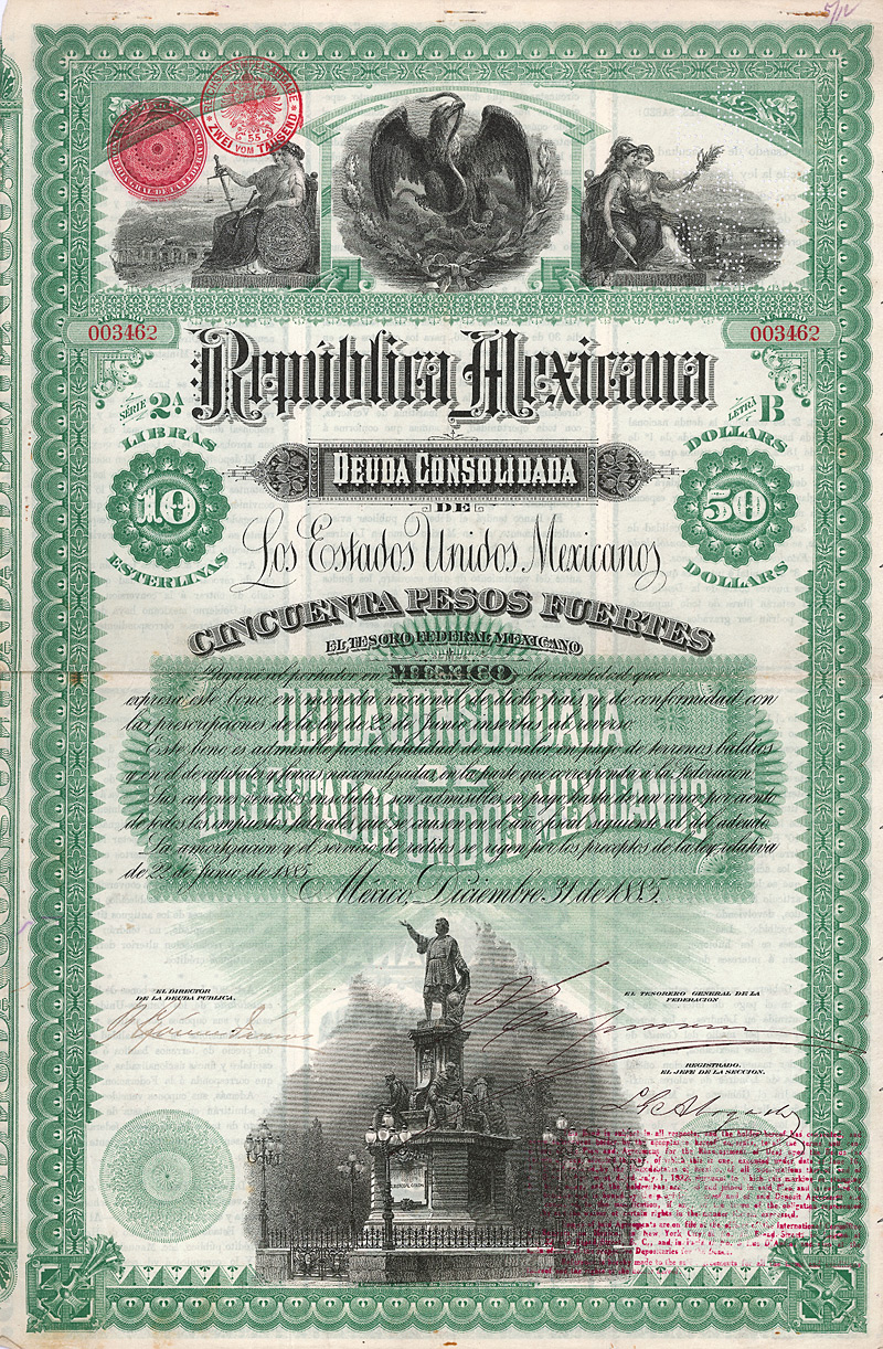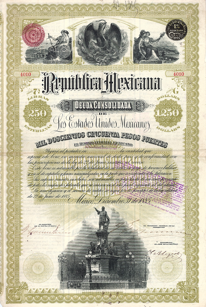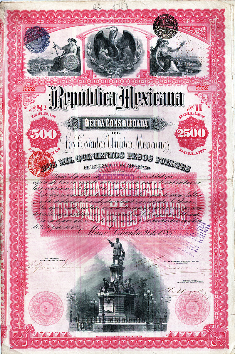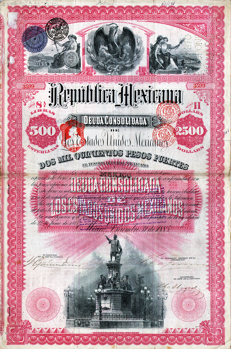 Auflage 35.000. Viersprachig spanisch/englisch/ deutsch/französisch. Stahlstich der ABNC, großes Wappen mit Adler und Schlange. Maße: 37,8 x 30,4 cm. Mit anhängenden restlichen Kupons ab 1928 (#47-100) + Warrants + Steuerausweis des Deutschen Reiches. Wurde im letzten Jahr spekulativ zu Preisen zwischen 500 Euro und 20.000 Euro gehandelt (angeblich mehrere Millionen USD wert). Nicht entwertet!