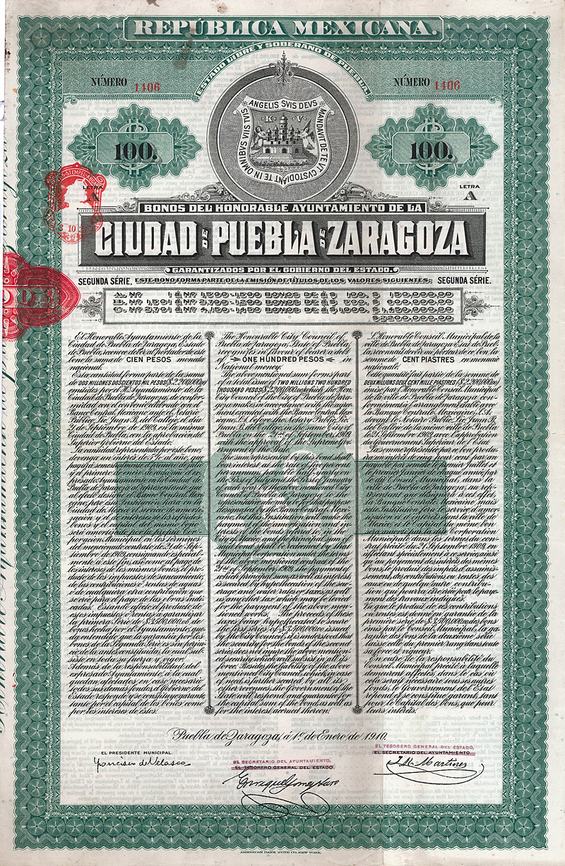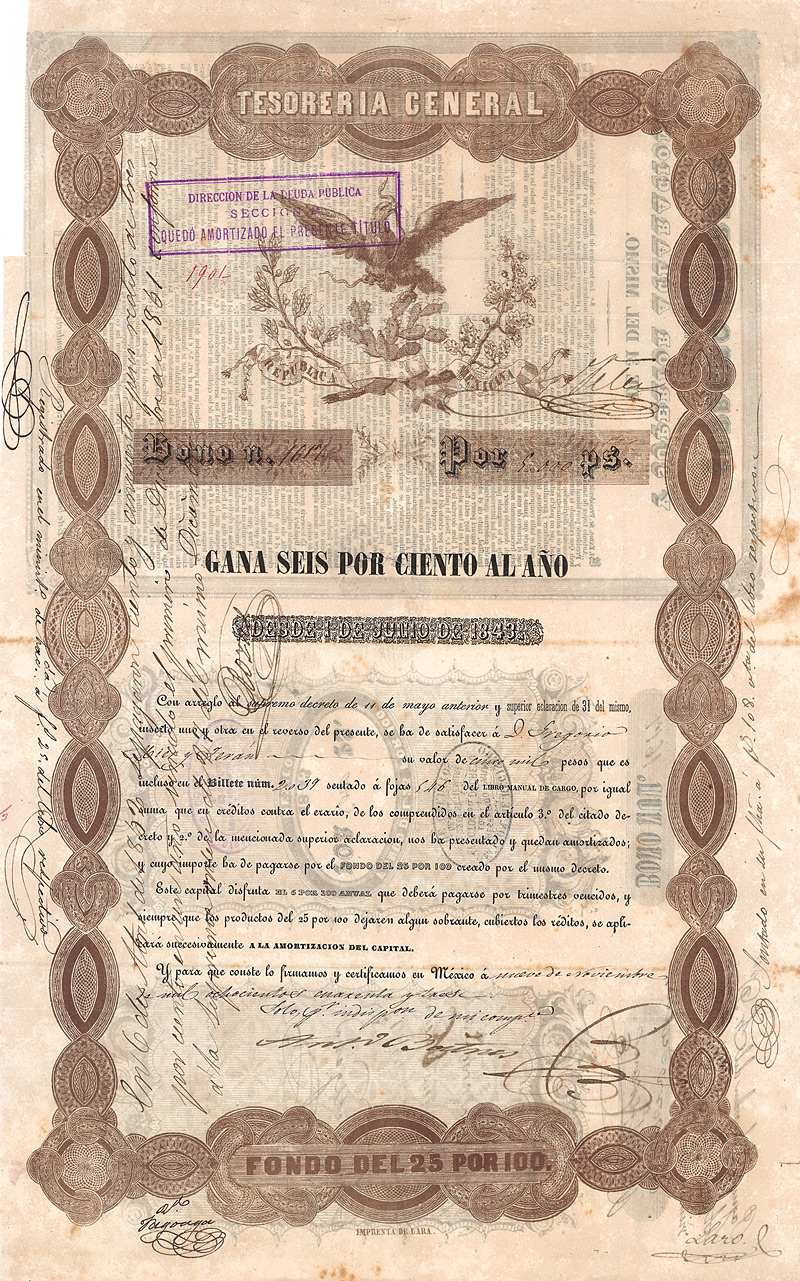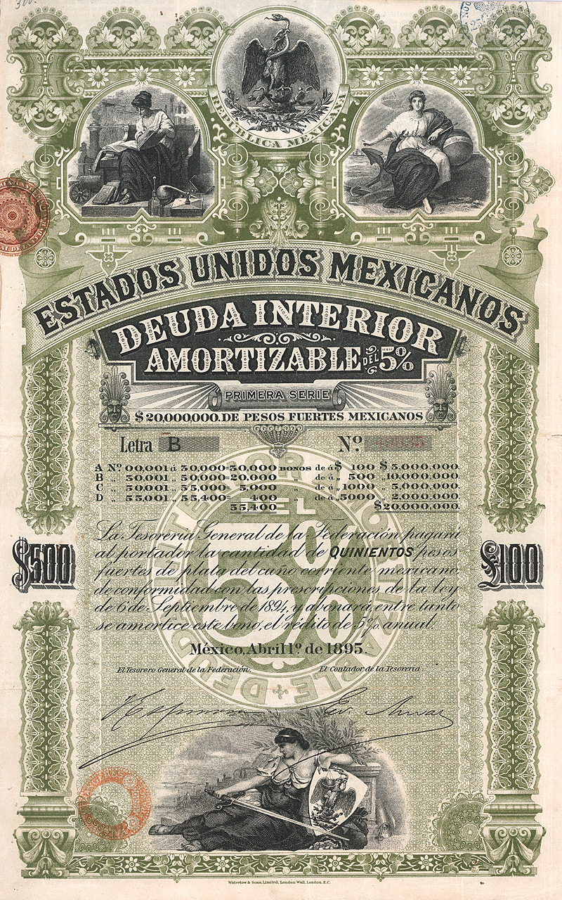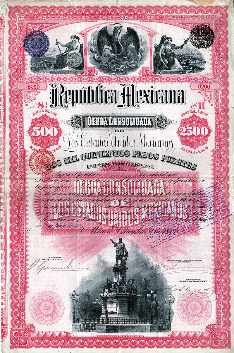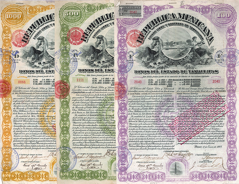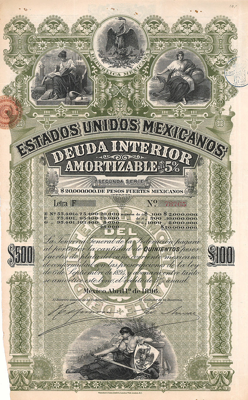 Auflage 35.000. Viersprachig spanisch/englisch/ deutsch/französisch. Stahlstich der ABNC, großes Wappen mit Adler und Schlange. Maße: 37,8 x 30,4 cm. Mit anhängenden restlichen Kupons ab 1928 (#47-100) + Warrants + Steuerausweis des Deutschen Reiches. Wurde im letzten Jahr spekulativ zu Preisen zwischen 500 Euro und 20.000 Euro gehandelt (angeblich mehrere Millionen USD wert). Nicht entwertet!