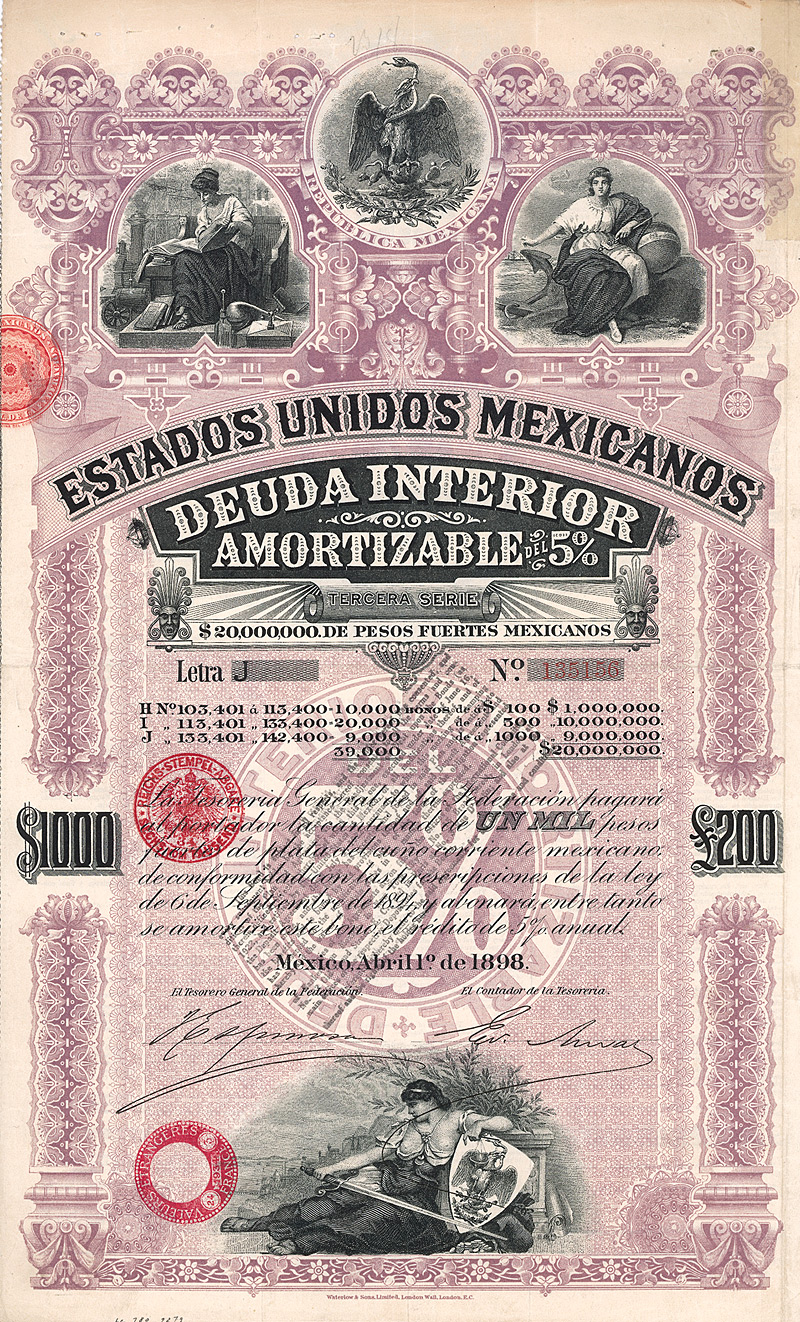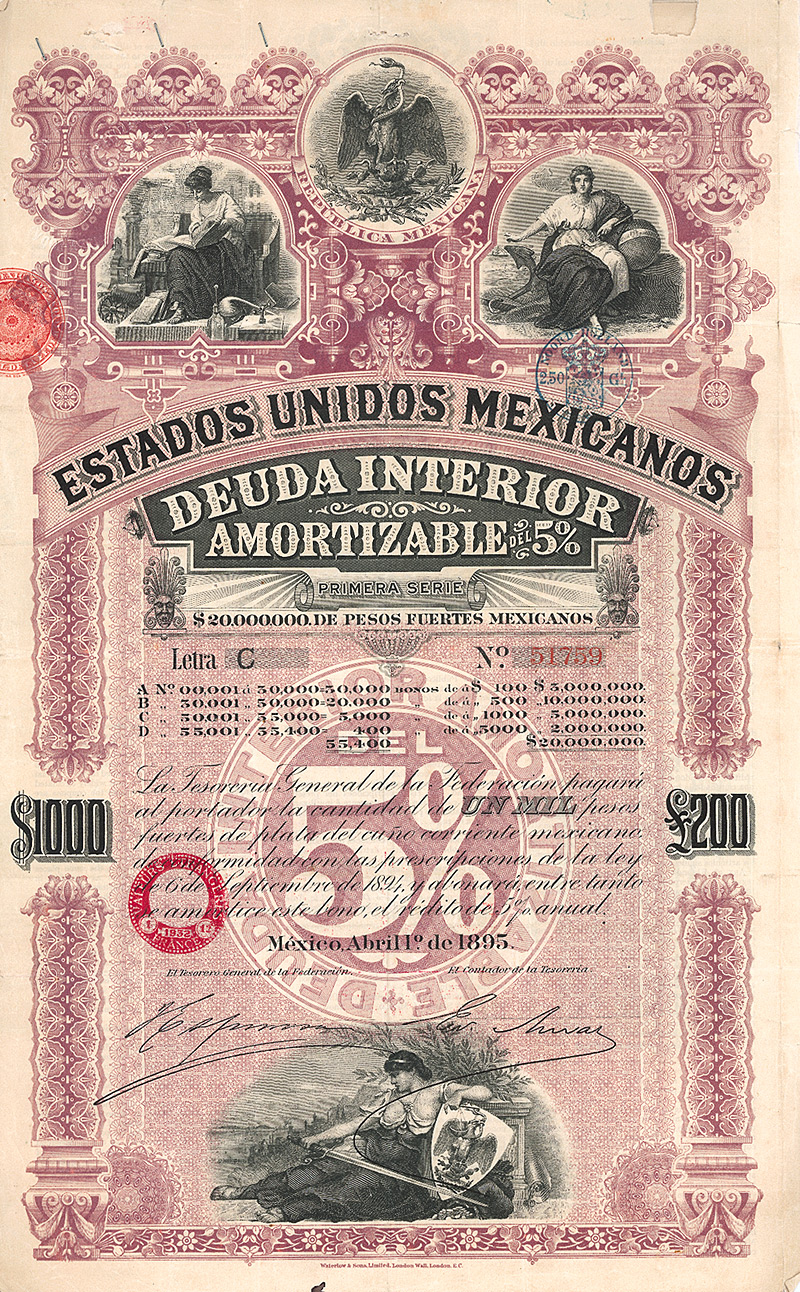 Auflage 8.000. Deuda Interior Amortizable. Äußerst dekorativer Stahlstich von Waterlow & Sons mit drei allegorischen Vignetten, u.a. barbusige Kriegerin mit Wappenschild, Adler mit Schlange. Maße: 38 x 23 cm. Mit Talon + Warrants + Steuerausweis des Deutschen Reiches von 1934. Nicht entwertetes Wertpapier!