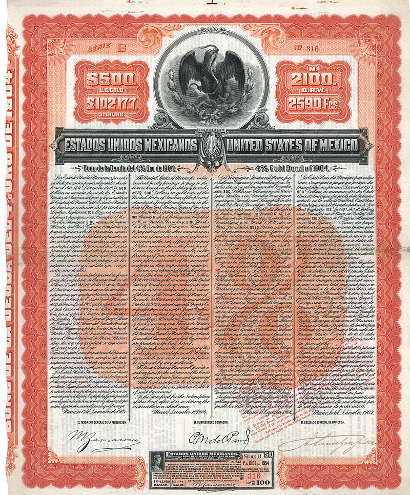 4,5 % Prior Lien Gold Bond 500 US-$ = 1.000 Mex.-$ Gold = 102.17.7 £ Sterling = 2.100 Mark = 2.590 F = 1.240 Gulden, Nr. D22572