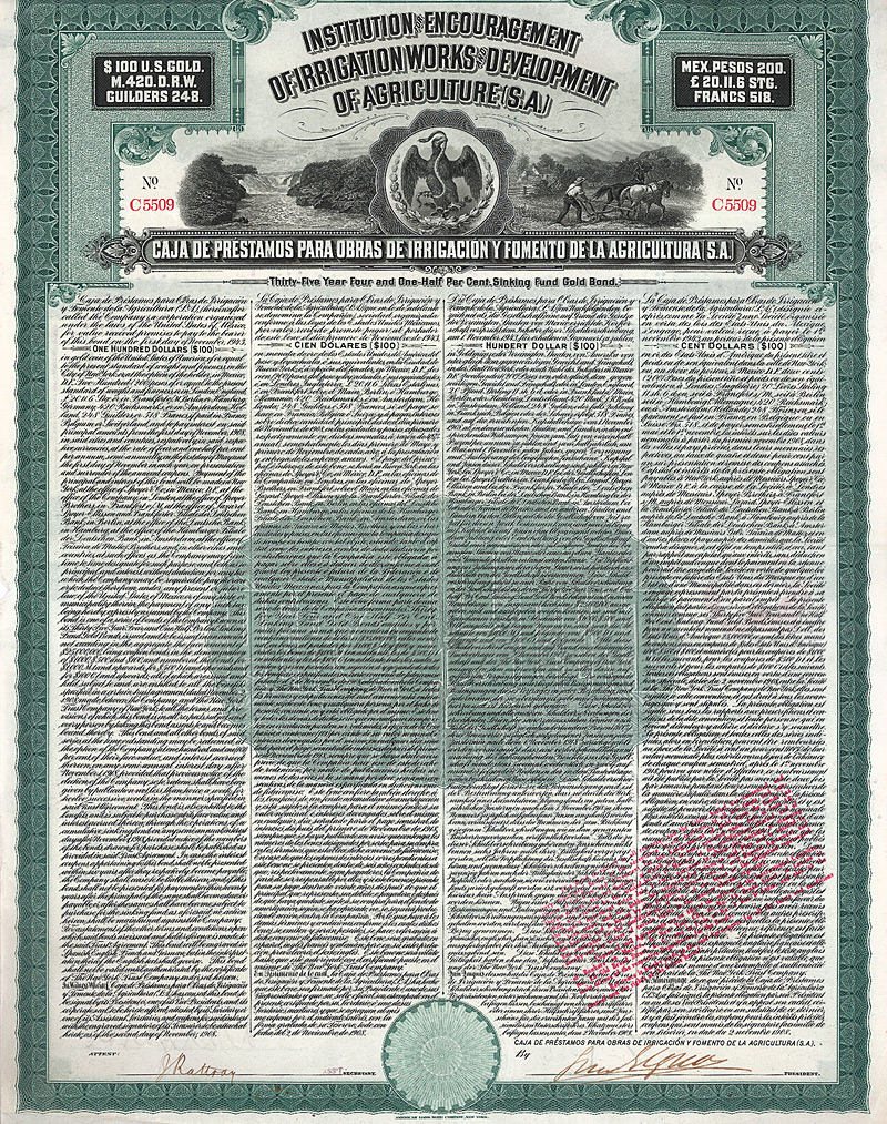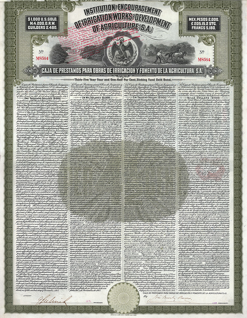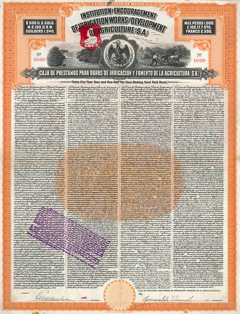 Gründung als AG 1908 aufgrund der Gesetze der Vereinigten Staaten von Mexico zur Förderung der Bewässerung und Entwicklung der Landwirtschaft. Stahlstich der ABNC mit Wasserfall, Bauer mit Pferdegespann, Adler mit Schlange. Viersprachig. Originalsignaturen. Maße: 44 x 33 cm. Mit anhängenden restlichen Kupons ab 1928 (#39-70) + Warrants + Steuerausweis des Deutschen Reiches von 1934. Nicht entwertet!
