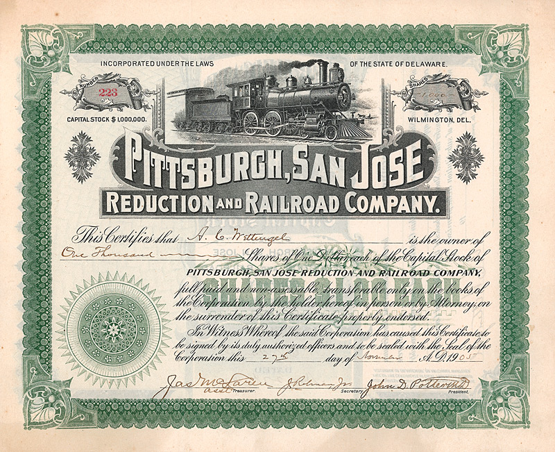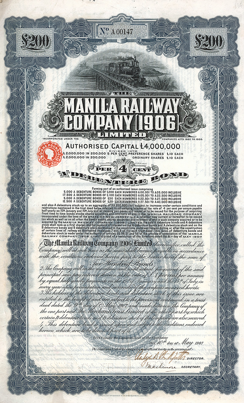 Auflage 5.000. Gründung 1888 als englische Gesellschaft zur Übernahme einer Konzession, die 1887 vom spanischen Gouvernment für eine Strecke von 196 km über 99 Jahre erteilt wurde. Die spanische Regierung zahlte regelmäßig die vertragsmäßig vereinbarten Zuschüsse. 1898 wurden die Philippinen nach dem Seesieg des Admirals G. Dewey über die Spanier bei Manila an die USA abgetreten, die die Verpflichtungen der Manila Railway gegenüber nicht erfüllten. 1903 wurde die Konzession von der Philippinischen Regierung übernommen. Nach langwierigen, aber ergebnislosen Verhandlungen mit den USA, wurde 1906 eine neue Eisenbahngesellschaft in New Jersey, USA, gegründet, die Manila Railway Co. (1906), die von der englischen Gesellschaft die Liegenschaften und die technische Ausrüstung übernommen hatte. Ihre Aktivitäten dauerten bis 1917 an. Dekorativer Stahlstich mit Dampflok auf Brücke. Maße: 43,7 x 27,2 cm. Mit anh. restlichen Kupons. Feine Perforationsentwertung. Äußerst seltener Nennwert.