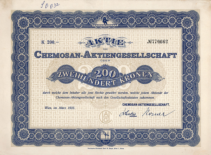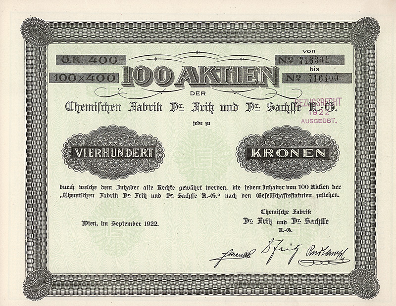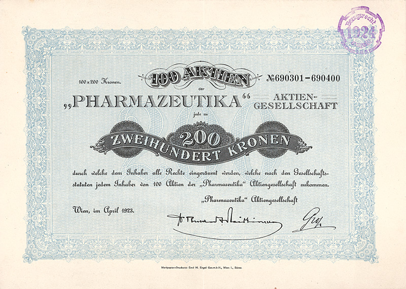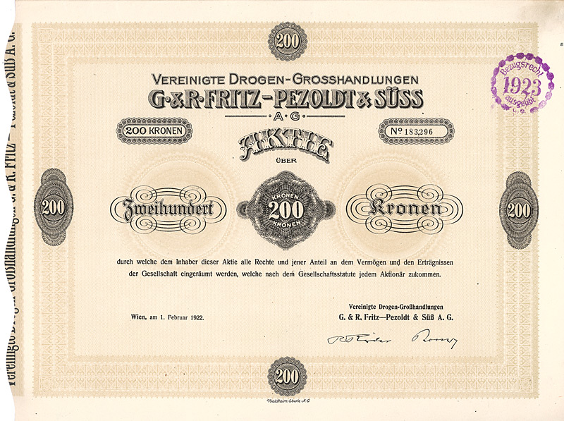 Gründung 1907. Die Gesellschaft erwarb unter Mitwirkung der Länderbank die Drogengroßhandlungen “G. & R. Fritz” und “Pezoldt & Süß”. Sie betrieb den Handel mit Medizinal- und technischen Drogen, Chemikalien, pharmazeutischen Produkten, chemischen und sanitären Utensilien. Sie führte besonders die Einrichtung neuer Apotheken durch und hatte einen bedeutenden Export, 1912 wurde ein eigenes Lagerhaus errichtet. 1920 gingen sämtliche Aktien der Philipp Röder-Bruno Raabe AG in den Besitz der Gesellschaft über. Maße: 26,8 x 35,5 cm. Doppelblatt, mit restlichem Kuponbogen. Einzelstück aus der Auflösung einer uralten Sammlung, sehr günstig angeboten!
