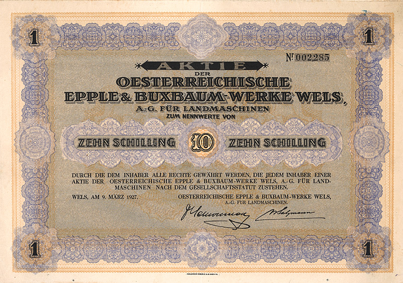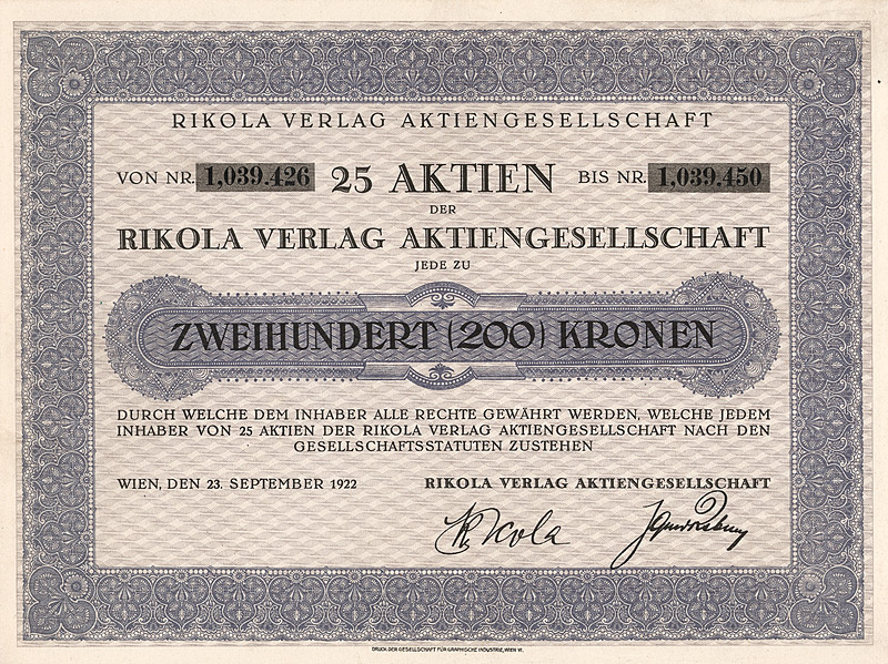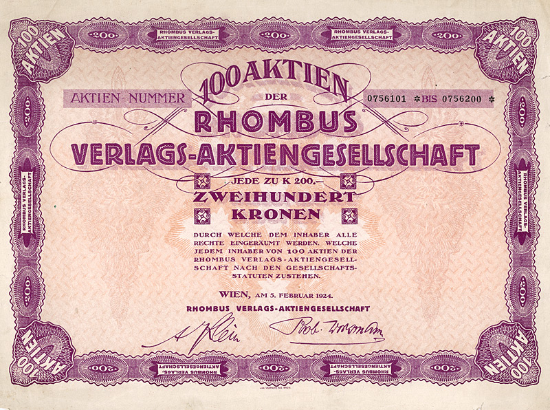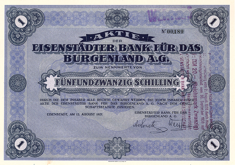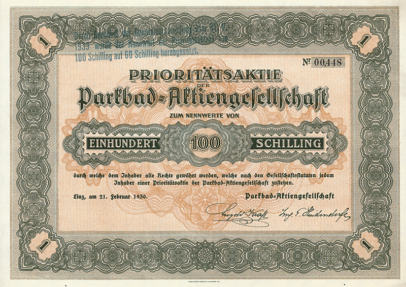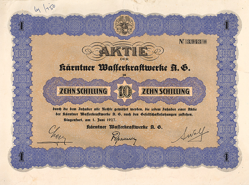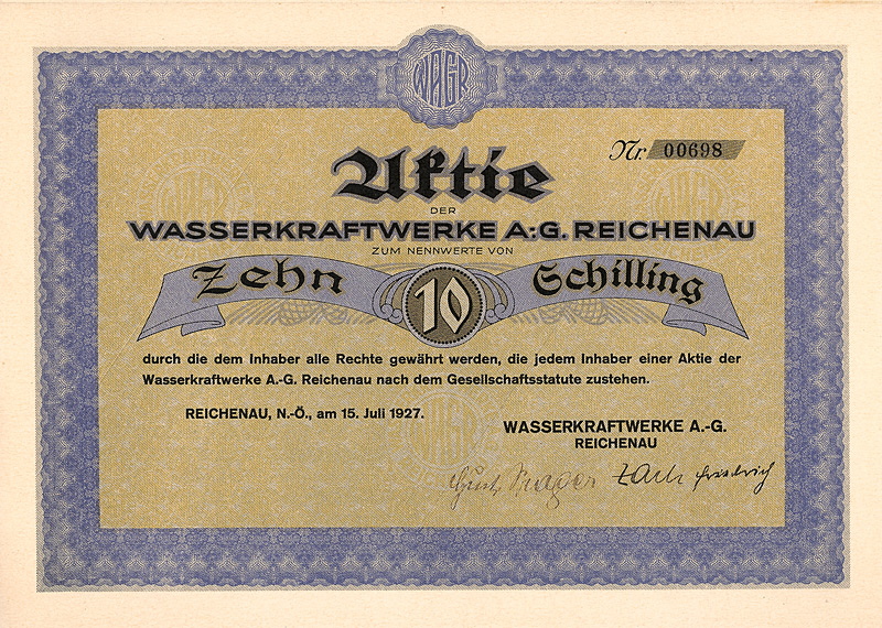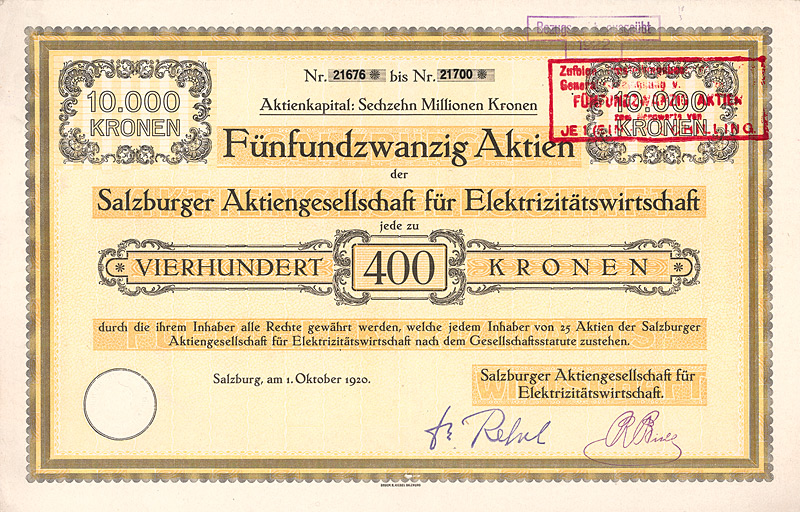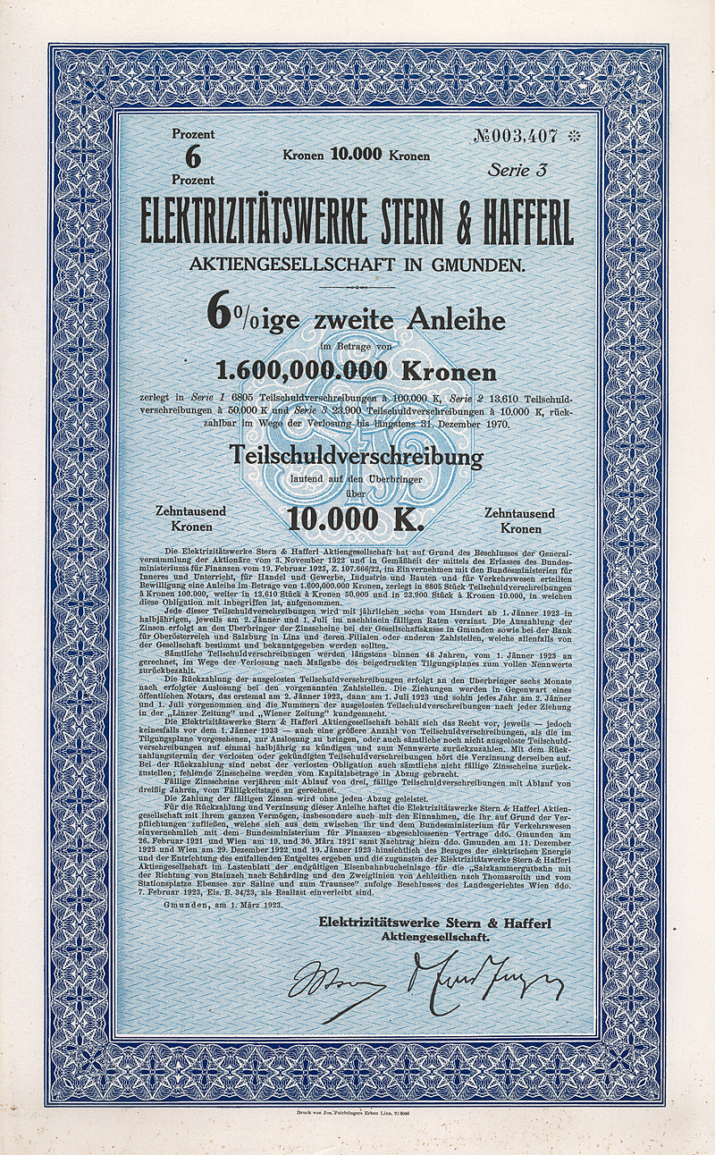 Auflage 12.000. Die am 13.2.1924 gegründete Ges. versorgte die Gemeinden Reichenau, Edlach, Prein und Hirschwang mit elektrischem Strom. 1937 Auflösungsbeschluß. Maße: 21 x 29,6 cm. Mit komplett anh. Kuponbogen. Einzelstück aus der Auflösung einer uralten Sammlung, sehr günstig angeboten!