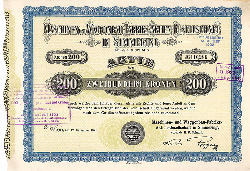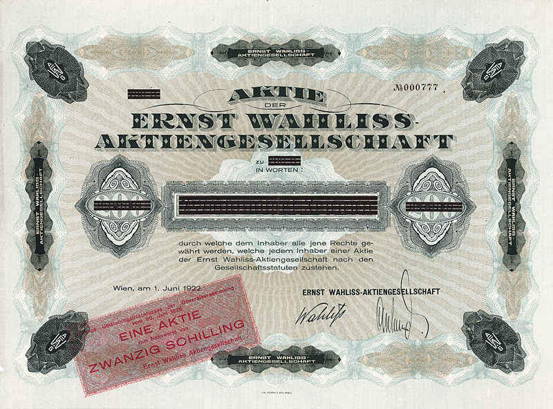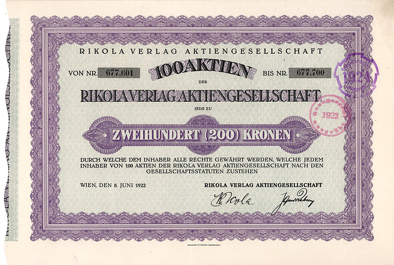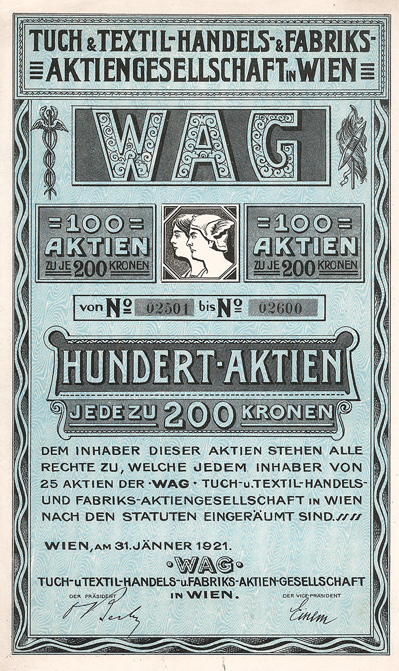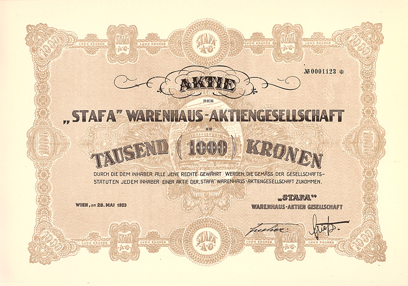 Gründeraktie. Gründung am 28.5.1923 zwecks Betrieb des 1911 errichteten Warenhauses Stafa. Eröffnet wurde das Gebäude am 18. August 1911 (zu Kaiser Franz Josephs 81. Geburtstag) als Gemeinschaftswarenhaus unter dem Namen Mariahilfer Zentralpalast - erstes Wiener Warenmuster und Kollektiv-Kaufhaus. Das traditionsreiche Kaufhaus im 7. Wiener Gemeindebezirk Neubau an der Mariahilfer Straße 120 bestand bis 1998. Nach einem ersten massiven Umbau vom Warenhaus zu einem Einkaufszentrum hieß die Stafa zwischen 1998 bis 2003 Eurocenter. Sehr dekorativ mit Unterdruckabb. des Kaufhauses. Maße: 25 x 35,2 cm. Doppelblatt, mit kpl. Kuponbogen. Einzelstück aus der Auflösung einer uralten Sammlung, sehr günstig angeboten!