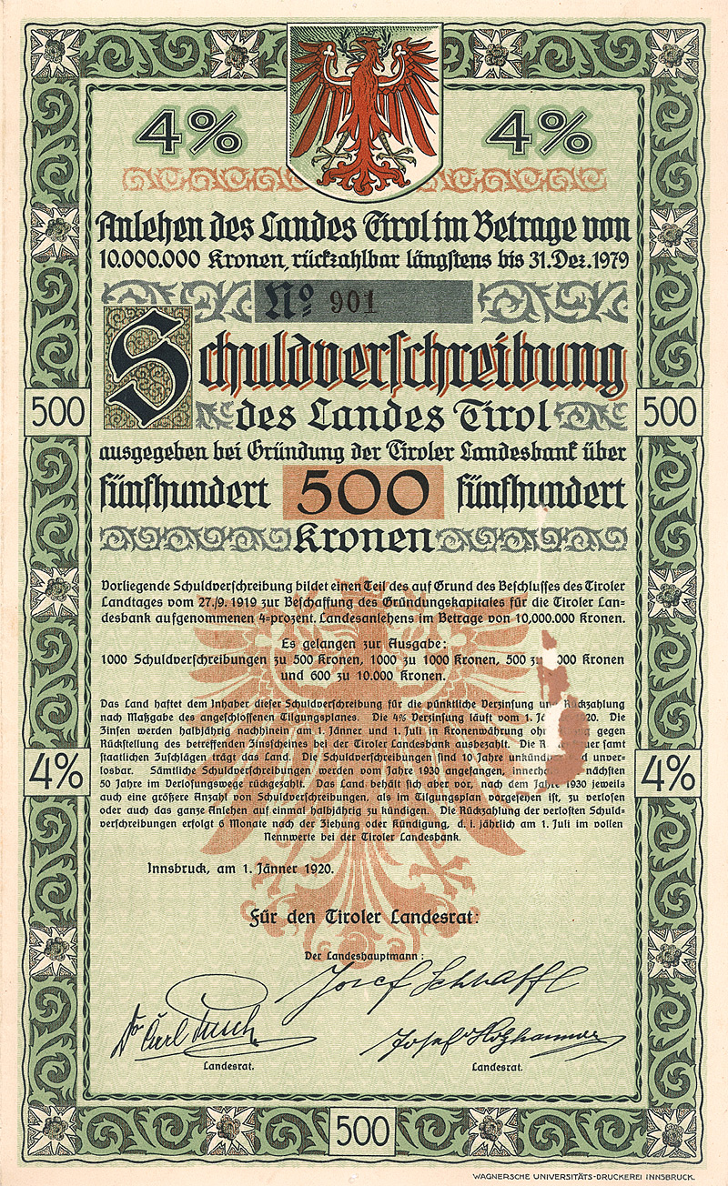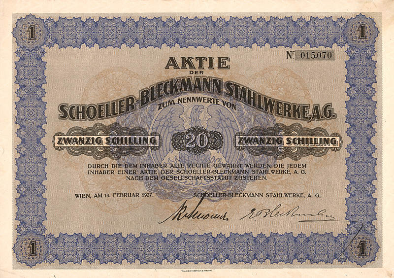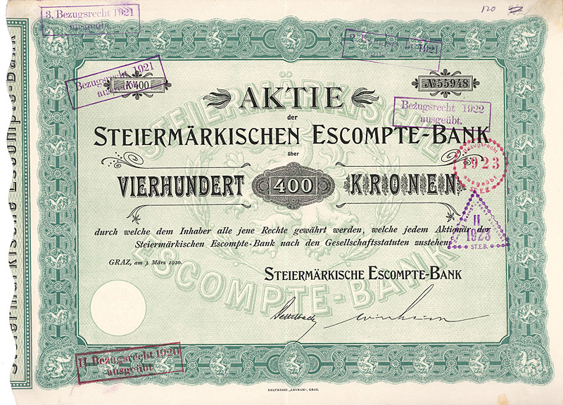 Die 1864 gegründete Steiermärkische Escomptebank entwickelte sich aus bescheidenen Anfängen in den Jahren des volkswirtschaftlichen Aufschwungs rasch zu einem bedeutenden Institut. Filialen waren in Klagenfurt, Laibach, Villach, Marburg, Görz und Wien. Die 1873er Krise brachte der Anstalt im Bankkommissionsgeschäft schwere Verluste, zu deren Deckung das Aktienkapital reduziert werden mußte. Stille Beteiligungen (darunter ein Posten Aktien der Leykam-Josefsthal-Papierfabrik, die 1869 von der Bank mitgegründet wurden) wurden nach und nach abgestoßen. Danach blieb die Bank von größeren Verlusten verschont. 1921 übernahm die Bayerische Vereinsbank AG in München einen größeren Aktienposten. 1934 Fusion mit der Bank für Steiermark. Dekorativ verziertes Papier. Maße: 26,7 x 36,2 cm. Doppelblatt, mit restlichem Kuponbogen. Äußerst selten angebotene Emission!