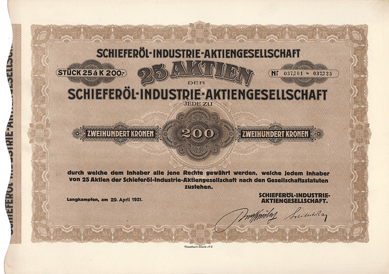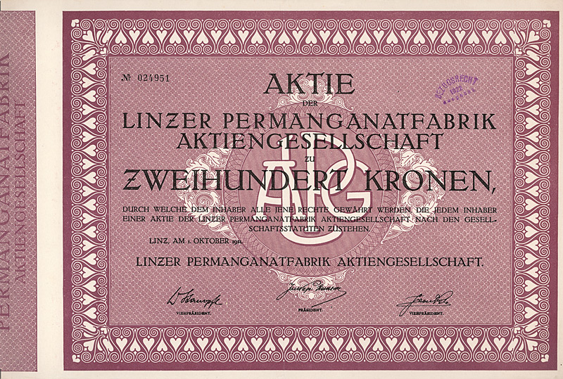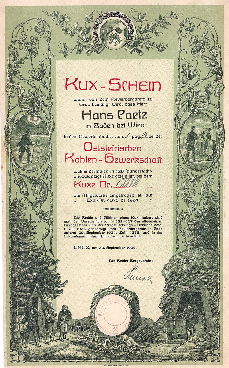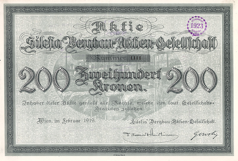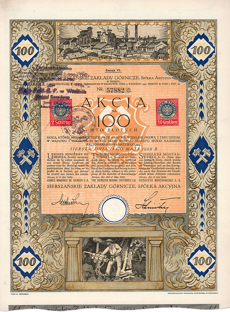 Gründung 1907 als “Galizische Montanwerke AG” zur Übernahme des Montanbesitzes des Grafen Andreas Potocki. Kohlengruben in Tenczynek und Sierza und Zinkhütte in Krze. 1921 wie oben umbenannt, nachdem das Gebiet nach Zerfall der Donaumonarchie zu Polen gekommen war. Dreisprachig, auch in deutsch. Hochdekoratives, farbenfrohes Stück mit Holzstichen des Werksgeländes sowie einer Grubenszene. Maße: 34,2 x 25,6 cm. Doppelblatt, mit Kupons. Vorderseitig Registerstempel der polnischen Konsularabteilung in Wien von 1949 (Gesetz vom 3.2.1947).