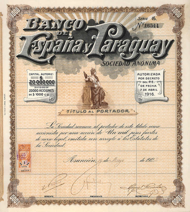 Bedeutende, 1916 gegründete Bank in Paraguay. Schöne Vignette mit gekrönter Fortuna auf einem Thron, zu ihren Füßen fließen Geldstücke aus einem Füllhorn. Originalunterschriften. Maße: 34,5 x 32,5 cm. Originalsignaturen, keine Entwertung.
