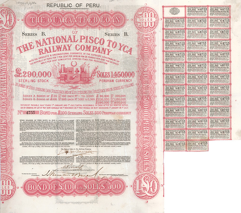 Eisenbahn aus den Bergwerksregionen zur Pazifikküste. Die älteste südamerikanische Eisenbahn-Anleihe! Großformatiges, dekoratives Stück, Abbildung Uralt-Lok und Wappen. Maße: 43,2 x 31,5 cm. Mit anhängenden restlichen Kupons ab 1876. Nicht entwertet!