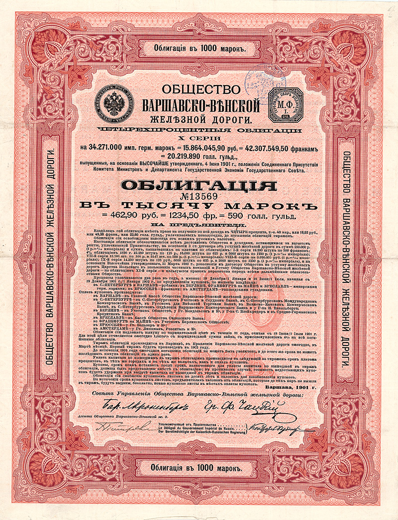 Nachdem die Ergebnisse trotz der von Jahr zu Jahr steigenden Bruttoeinnahmen ungünstig waren, sah sich der Staat veranlaßt, die Bahn einem Konsortium, das sich wieder als Warschau-Wiener Eisenbahngesellschaft konstituiert hatte, 1857 auf 75 Jahre pachtweise abzutreten. 1890 vereinigte sich die Warschau-Wiener Eisenbahn mit der Warschau-Bromberger Bahn. 1900 übernahm die Warschau-Wiener Eisenbahn den Bau einer eingleisigen Eisenbahn mit normaler russischer Spur von Warschau über Lowicz-Lodz bis Kalisch und bis zur preußischen Grenze sowie einer Verbindung dieser Bahn in Warschau mit der Gürtelbahn der Weichselbahn (eröffnet 1903). Mit Wirksamkeit am 1. Januar 1912 erfolgte durch Gesetz vom 19. Dezember 1912 der Erwerb der Warschau-Wiener Eisenbahn durch den Staat. Das Anlagekapital auf Aktien belief sich zum Zeitpunkt der Verstaatlichung auf 25 Millionen Rubel. Die Dividende erreichte 1899 den Höchststand mit 26,25%, 1913 belief sie sich auf 13,88%. Maße: 36 x 27,9 cm. Mit anhängendem restlichen Kuponbogen.