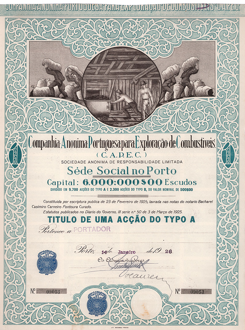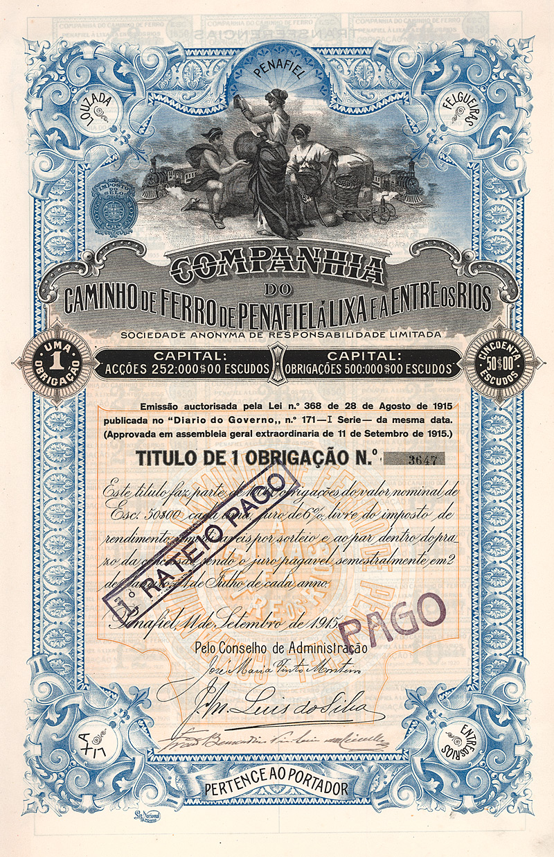 Auflage 10.000. Die 1911 gegründete Gesellschaft betrieb eine Schmalspurbahn zwischen den Städten Penafiel und Lixa im Norden Portugals. Hochdekorativ lithographierte Vignette mit Hermes und zwei weiblichen Allegorien, dahinter zwei schmauchende Eisenbahnen. Maße: 43,5 x 28 cm. Mit anhängenden restlichen Kupons.