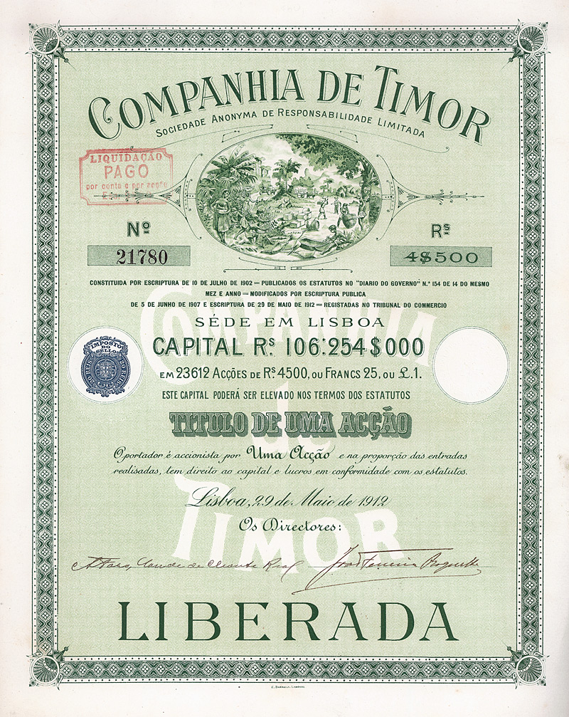 Die Gesellschaft wurde 1902 von wohlhabenden Lissaboner Kaufleuten gegründet. 1907 hatte sie bereits 5.000 Hektar in Osttimor. Es wurde vornehmlich Kaffee angebaut. Sehr schöne Vignette mit geschäftigem Treiben auf einer Plantage, u.a. barbusige Frauen. Maße: 34,8 x 27,6 cm.