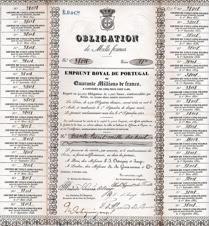 Auflage 40.000. Eine besonders frühe portugiesische Auslandsanleihe (Volumen 40 Mio. Francs, Zahlstellen waren Privatbankhäuser in Paris und London). Ausgegeben in einer überaus bewegten Zeit der portugiesischen Geschichte, in der das Beispiel Spaniens mit seinen Umstürzen und Militärrevolutionen Nachahmung fand. Es regierte gerade die Königin Maria auf Basis der Verfassung Dom Pedros vom April 1826. Doch die Opposition bestand auf der älteren Verfassung vom September 1822 (wonach sie auch “Septembristen” genannt wurden). Am 9.9.1836 kamen dann die Septembristen durch einen Staatsstreich an die Macht. Text in französisch, mit Originalunterschrift, verzierter Umrahmung und königlich portugiesischem Wappen. Maße: 30,3 x 15,6 cm. Mit anhängenden restlichen Kupons ab 1834 (bis 1864). Nur 6 Stücke sind seit vielen Jahren bekannt, 3 entwertete und 3 nicht entwertete. Das hier angebotene Exemplar ist nicht entwertet!