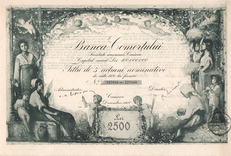 Gründung 1899. Die regional bedeutende Handelsbank pflegte hauptsächlich das Escomptegeschäft. 1931 leistete sich die Bank eine eigene Automobilfabrik, die “Sebar”. Aufgrund von dubiosen Geschäften verlor die Bank drei Viertel ihrer offenen Rücklagen und mußte 1934 reorganisiert werden. Kunst auf Wertpapieren. Dieses herrliche Papier wurde entworfen von dem rumänischen Landschaftsmaler Lucian Grigorescu, geboren 1894 in Medgidier, ansässig in Bukarest. Maße: 21,4 x 33,3 cm. Mit anhängenden restlichen Kupons.