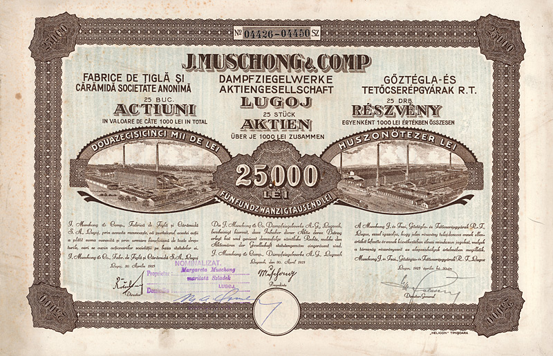 Gründeraktie. Gegründet mit einem Aktienkapital von 15 Mio. Lei. Die Gesellschaft ging aus der gleichnamigen, 1888 gegründeten KG hervor. Sie besaß drei Ziegelfabriken, in denen 1200 Arbeiter beschäftigt wurden. Die Stadt Lugosch (rum. Lugoj) im Banat, an der Bahnstrecke Temesvar-Orsova gelegen, bestand zu ca. 30 % aus Deutschen. Die heimische Industrie konzentrierte sich hauptsächlich auf den Weinanbau und die Herstellung von Seide. Aktientext rumänisch/deutsch/ungarisch. Sehr dekorative Gestaltung mit zwei Werksabbildungen, jeweils grosse Anlagen mit zahlreichen Gebäuden und rauchenden Schornsteinen. Originalsignaturen. Maße: 25 x 38,7 cm. Doppelblatt, mit restlichen Kupons.