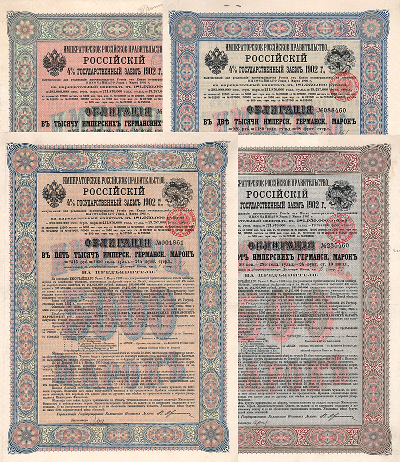 Die Kapitalbeschaffung für den Zarenhof und die russische Wirtschaft erfolgte ab der zweiten Hälfte des 18. Jh. bis zur Oktoberrevolution im westeuropäischen Ausland über die Hofbankiers (die zum großen Teil aus Deutschland stammten, weshalb sich auch die deutsche Sprache zunehmend im Bankgeschäft Russlands ausbreitete). Teil einer Anleihe von 393 Millionen Mark, ausgegeben zur “Realisirung der Russland von China zukommenden Entschädigungssumme auf Grund des Allerhöchsten Ukases vom 1.3.1902” für die während der Unruhen in China erlittenen Verluste. Rückseitig Text auch in deutsch/englisch. Dekorativ. Alle Stücke mit restlichen Kuponbögen, nicht entwertet.