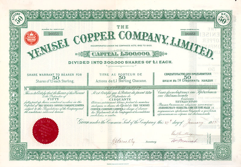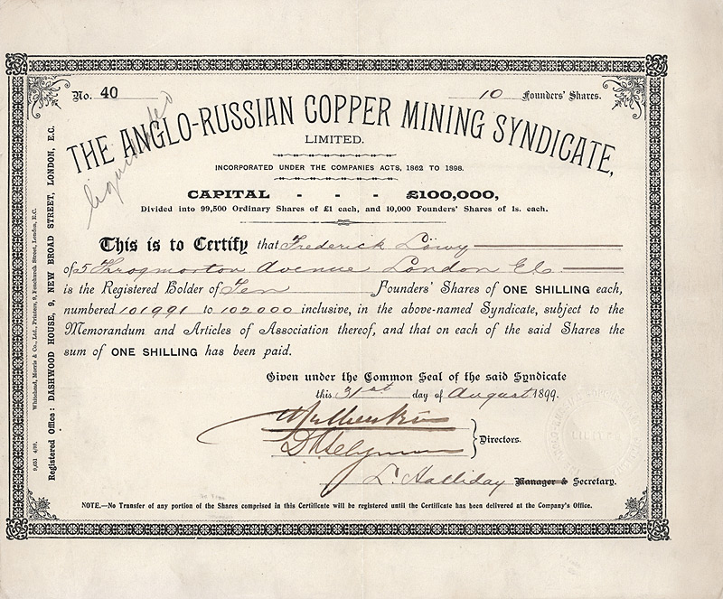Англо Русский медно-горнопромышленный синдикат с ограниченной ответственност. Das Aktienkapital der Gesellschaft in Höhe von 100.000 £ war eingeteilt in 99.500 Ordinary Shares und 10.000 Founders‘ Shares. Die Gesellschaft betrieb seit 1899 Kupfergruben im Gouvernement Elisawetpol, im Bezirk Sangesur. Die Gruben hatte sie von den russisch-armenischen Kaufleuten Melik-Asarjanz und Mutafow erworben. Diese Gruben mit Hüttenwerk besteht noch heute unter dem Namen “Sagesurskij Kupfer und Molybdän - Kombinat”. Das Anglo Russian Copper Mining Syndicate hatte noch weitere Gruben, im Gouvernement Tiflis, Bezirk Telavi, die zuvor im Besitz der grusinischen Fürstenfamilie Karalow (Karalaschwili) waren. Originalsignaturen. Maße: 24,7 x 29,8 cm. Bislang völlig unbekanntes Papier!