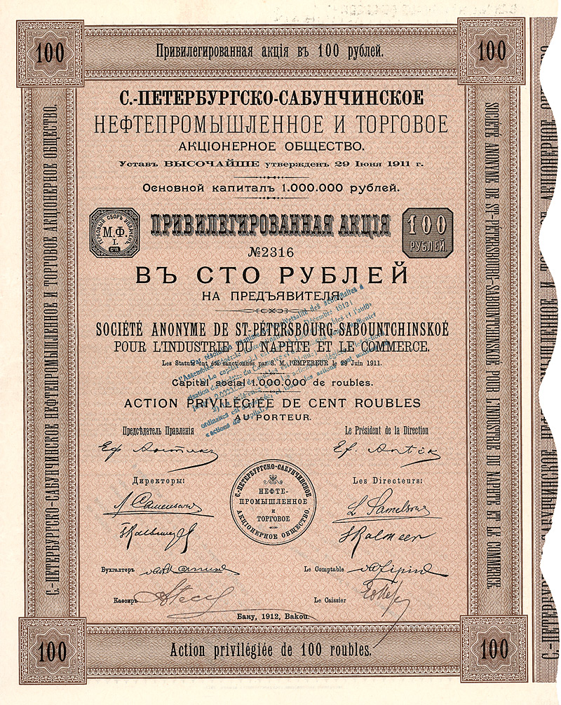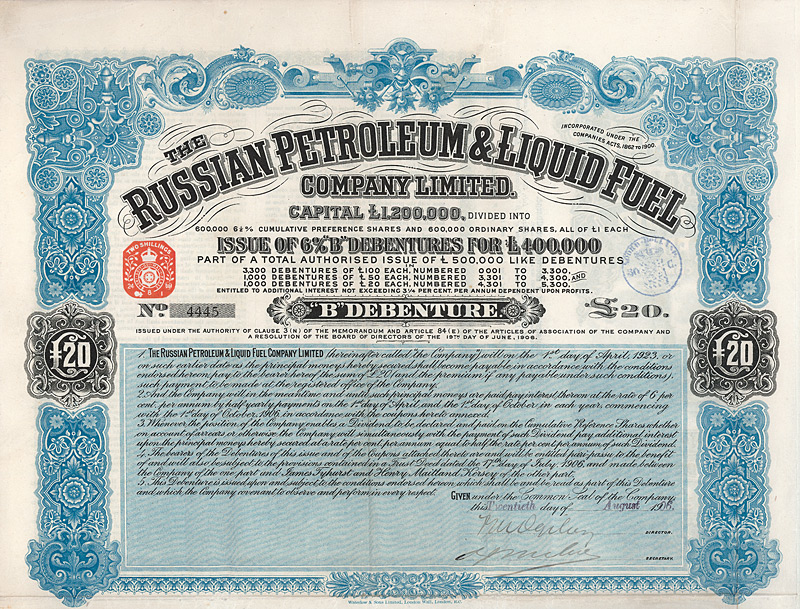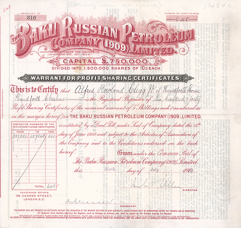 Бакинсуое общество русской нефти, с ограниченной ответственности. Bei der Ges. handelt es sich um eine Neugründung der ursprünglich 1898 eingerichteten Gesellschaft “Baku Russian Petroleum Company Ltd”. Die neue Ges. trägt daher den Zusatz in Klammern (1909). Gründer war Sir James Kiston mit einer Reihe von Partnern, u.a. Haci-Zeynal-Abdin Tagiyev und Evelyn Gubbard. Tagiew (1823 - 1924) war der größte Erdölkönig von Baku, der als Maurer angefangen hatte und erst mit 47 Jahren 1870 ins Erdölgeschäft eingestiegen war. Evelyn Hubbard (1852-1934) war ein Verwandter der St. Petersburger Industriellenfamilie, die u.a. in St. Petersburg das Handelsunternehmen Hubbard, Egerton & Co. sowie die Kattunmanufaktur in Schlüsselburg besaß, und die Spassker Spinnerei und Weberei betrieb. Statthalter der Gesellschaft in Russland war der englischstämmige St. Petersburger Kaufmann Jakob William Wischau. Baku Russian Petroleum betrieb die Erdölfelder, die vormals den einheimischen Unternehmen “G.A. Arafelow & Co.”, “Gebr. Bunych”, und “Gebr. Jakob und Akim Adamow” gehörten. Das waren Felder in den Bakuer Ortschaften Bibi Eybat, Balachani, Sabunchi, Romaninsk, Bina, But, Sobrat und anderen Orten der Halbinsel Apscheron. Darüber hinaus gehörten der Gesellschaft Ölquellen im Terek-Gebiet, sowie Anteile an der Gesellschaft “Russian Petroleum and Liquid Fuel Company Ltd.”, einem Raffinierie- und Öltransport-Unternehmen, von dem in dieser Auktion eine Schuldverscheibung angeboten wird. Profit Sharing Certificate. Originalsignaturen. Rückseitig Bedingungen. Maße: 28,2 x 29,6 cm. Knickfalten, sonst tadellose Erhaltung. Äußerst seltenes Papier!
