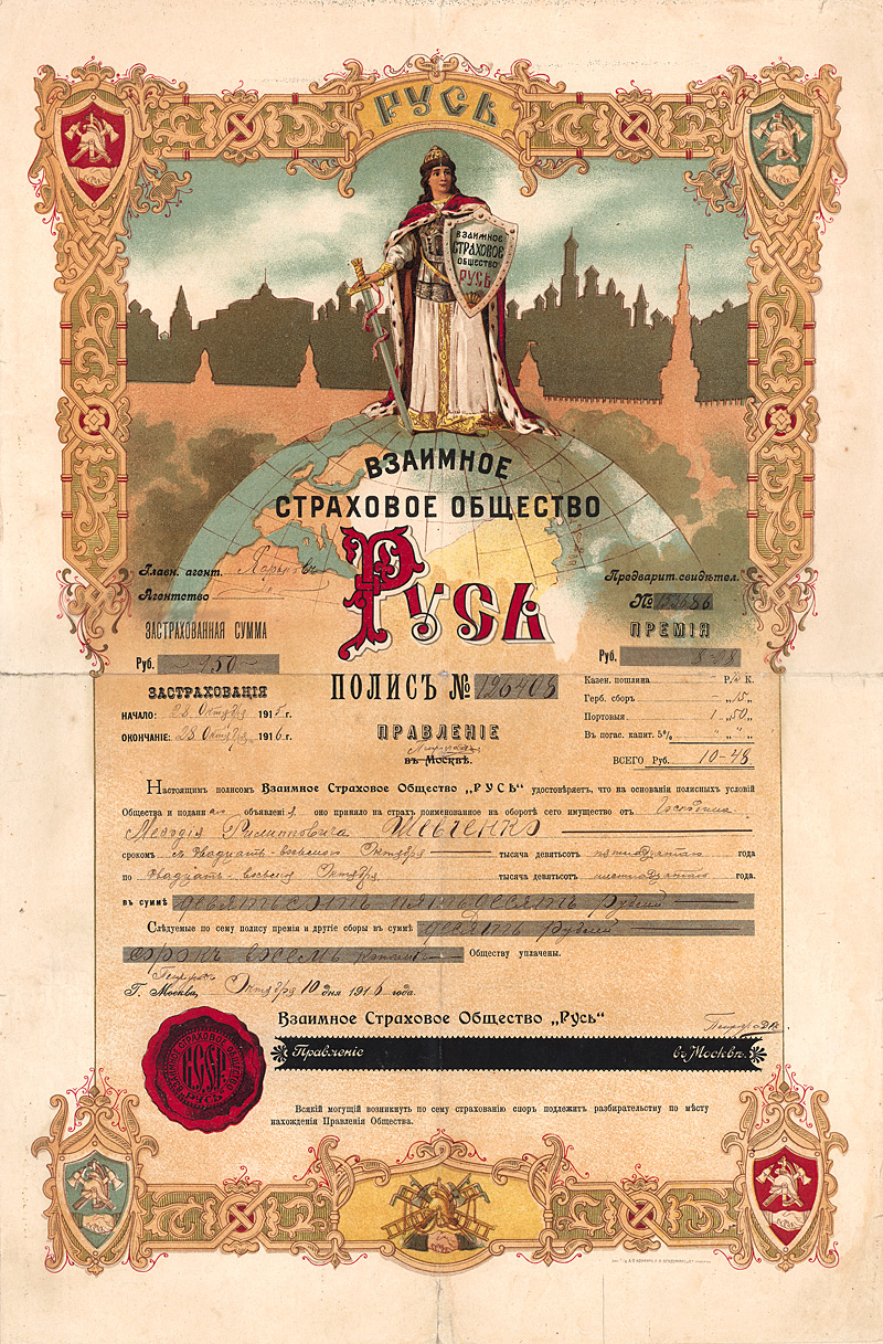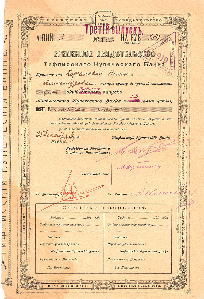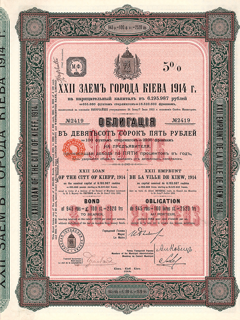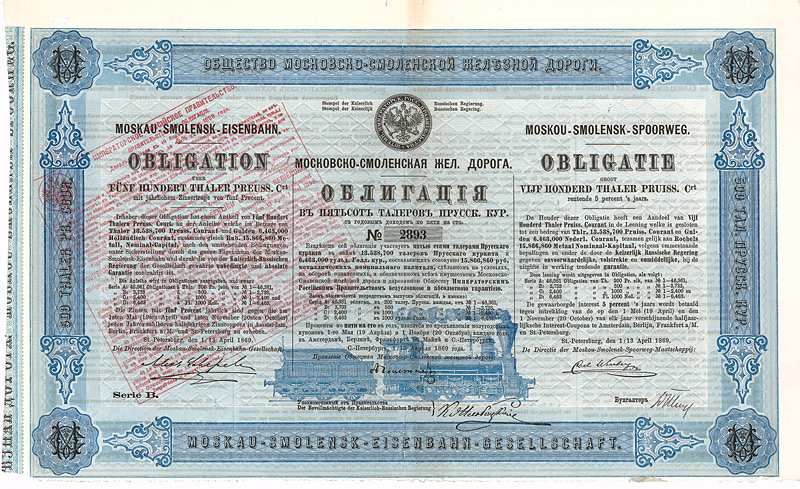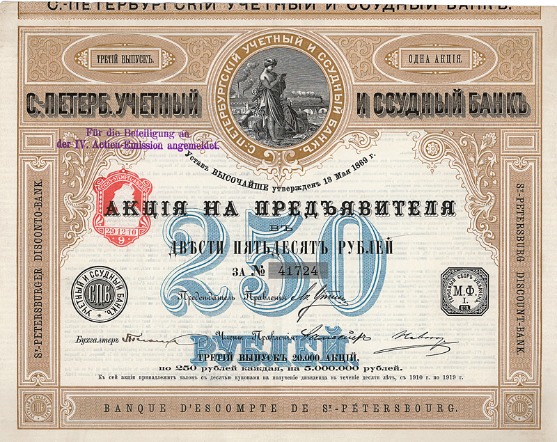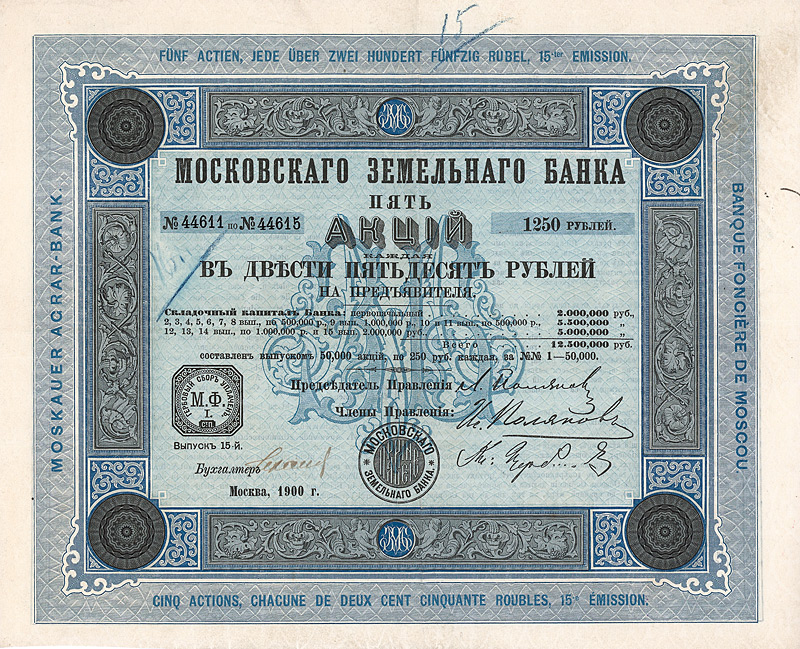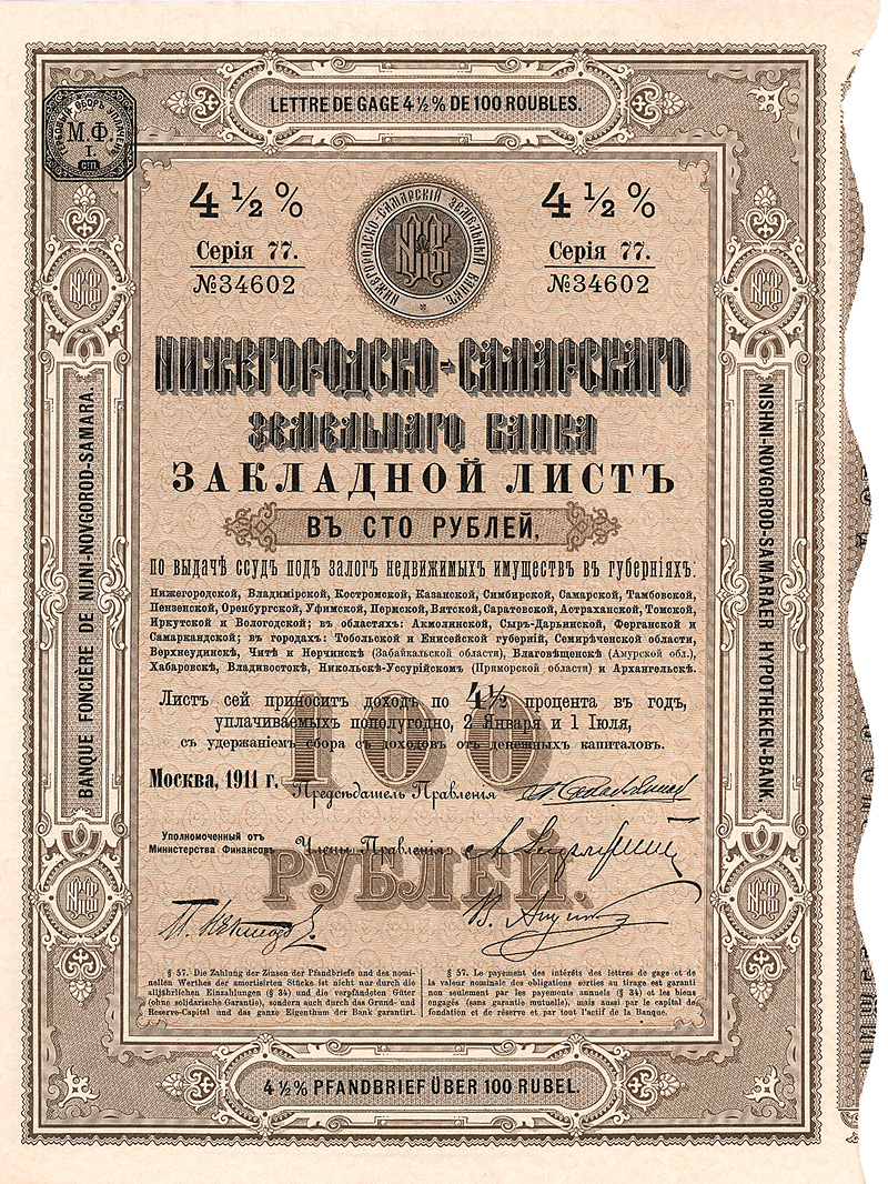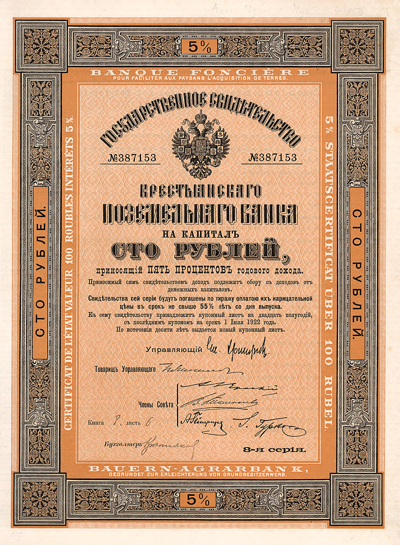 Gegründet 1882 zur Erleichterung des Kaufs von Adelsland nach Herabsetzung der Ablösungsschuld der Bauern im Jahre 1881. Die Gründung erfolgte im Anschluss an die Ideen von Schultze-Delitzsch und die Semstwos. Wie in Deutschland erwuchs in Russland im Anschluss an die Bauernbefreiung ein lebhaftes bäuerliches Kreditbedürfnis. Solange der Wucherer 24% bis 96%, im Durchschnitt 48% Zinsen jährlich verlangte, konnte die bäuerliche Wirtschaft nicht gedeihen. Text vorder- und rückseitig russisch, Umschriften auch französisch/deutsch. Maße: 34 x 25,5 cm. Mit anhängenden restlichen Kupons.