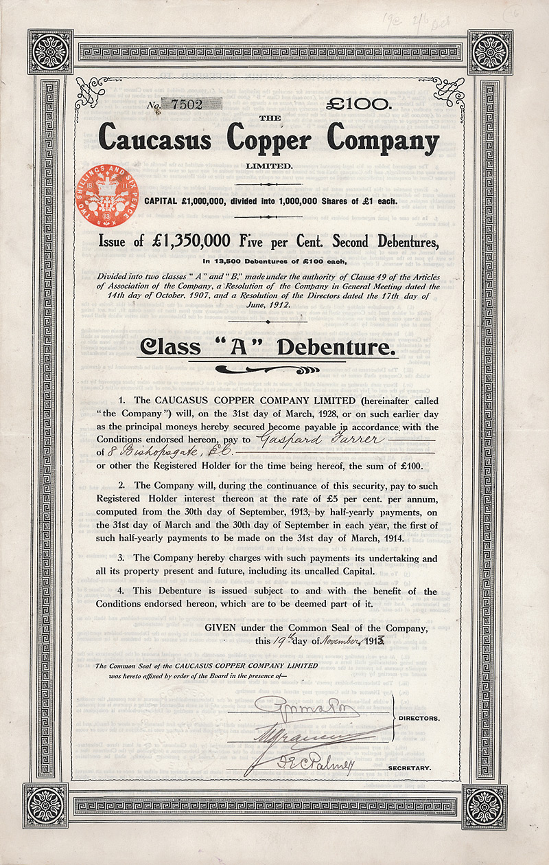 Кавказское меднопромышленное общество с огранической ответственности. Auflage 8.500. Gegründet 1900 in London mit einem Grundkapital von 500.000 Pound Sterling. Die Ges. erhielt die “allerhöchste” Bewilligung von der zaristischen Regierung für ihre Tätigkeit in Russland am 1. Juni 1901. Die Verwaltung dieser englischen Gesellschaft befand sich in der Georgischen Hafenstadt Batum und wurde vom russischen Staatsbürger britischer Abstammung William Williamowitsch Stuart wahrgenommen. Die Ges. betrieb in Georgien (Grusinien) zwei Förderstätten. Die erste war eine eigene, die “Dsansulsker Grube”, zur Förderung von Kupfer im Artwinsker Landkreis, Gouvernement Kuta’issi. 1913 förderte die Ges. 224.500 Tonnen Kupfererz mit einem Feinkupfergehalt von 3-5 Prozent. Bezogen auf Reinkuper betrug die Produktion in den 7 Jahren von 1907 bis 1914 16.000 Tonnen. Caucasus Copper war damit die Grube mit der höchten Förderquote im gesamten russichen Kaiserreich. Von den 25 Kupfergruben Russlands förderten damals nur 4 Gruben mehr als 100.000 Tonnen Erz. Die zweite Grube war die in Pacht genommene Grube des Grundbesitzers N.F. Griewskij zur Förderung von Kupfer und anderen Metallen, wie Silber und Blei. Heute gehört das Territorium der Kupfergrube von Caucasus Copper zum Gebiet Murgul, in der Türkei, nachdem mit dem Friedensvertrag von Lausanne im Jahre 1923 das Gebiet der Turkei zugesprochen worden war. Großformatiges Papier. Originalsignaturen. Blindprägestempel, engl. Steuerstempel rot, inwendig Bedingungen. Maße: 42 x 26,9 cm.