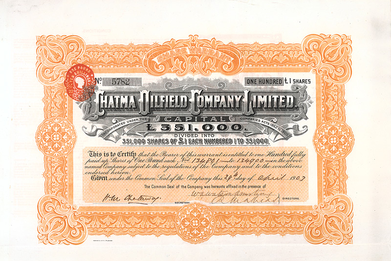 Чатминское нефтепромышленное общество с ограниченной ответственности. Die Gesellschaft wurde am 15. Februar 1903 von Lord Armstrong und seinen Compagnons, den britischen Kaufleuten Tefnell, R. Matthias, M. Matthias, M. Massinez, Len-Cleypon und I. Mitsakis in London gegründet und erhielt im gleichen Jahr die Konzession für Erkundungsbohrungen und die Förderung von Erdöl in der Ortschaft Chatma, Bezirk Signachi, Gouvernement Tiflis, sowie in weiteren Orten des Kaukasischen Kreises. Die Gesellschaft hatte Ihren verantwortlichen Agenten in Russland in der Person von Franz F. Madhurst in St. Petersburg, der auch Statthalter für andere englische Firmen, wie Babcock Wolcox, Armstrong Withworth, und die deutsch-englische Firma Vereinigte Radio & Telegrafen in Russland war. Die englischen Investoren der Chatma Oilfield Company waren angelockt worden durch den Tatbestand, dass an vielen Stellen der vulkanischen Region Chatma und Signachi, das Erdöl an vielen Stellen direkt aus der Erdoberfläche austritt. Noch heute kann man solche Orte in der dortigen steppenartigen Landschaft entdecken. Roter britischer Steuerstempel, Firmenemblem im Blindprägestempel, Originalsignaturen. Maße: 25,8 x 41 cm. Mit komplett anhängenden Kupons. Äußerst selten!