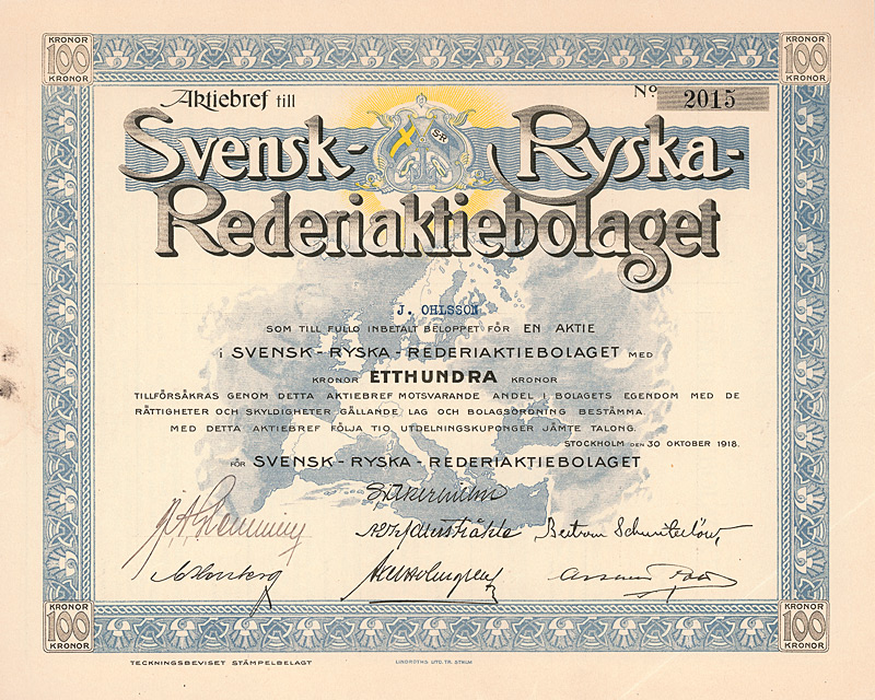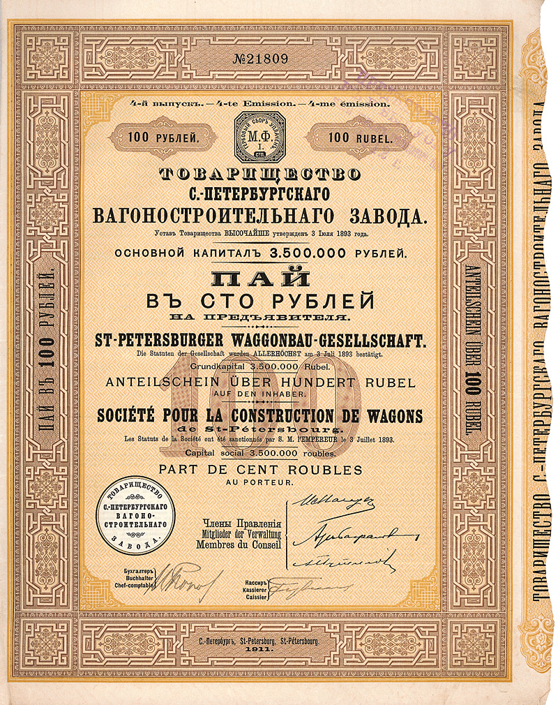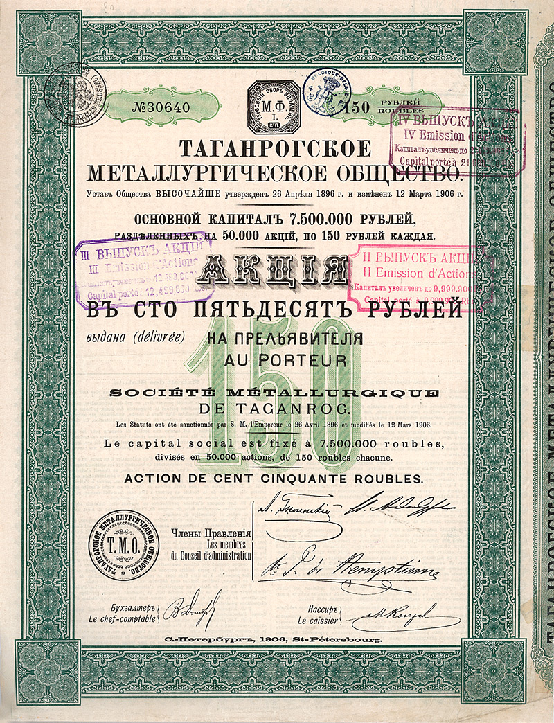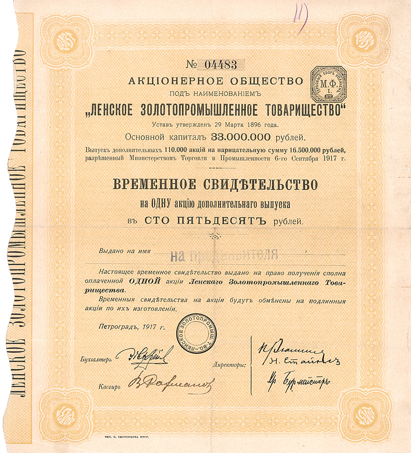 Die Lenskoye Goldindustriegesellschaft, auf russisch auch kurz “Len’soloto” genannt, ist eine der ältesten Goldminengesellschaft Russlands, sie bestand bereits seit 1855 als Personengesellschaft. An ihr waren St. Petersburger Privatbankiers beteiligt, die 1896 die Gesellschaft an die Börse brachten, um für die Ausweitung der Tätigkeit neues Kapital zu aquirieren. Bei den Bankiers handelt es sich um Baron Gorazij Ginzburg mit seinen Söhnen Alexander und Alfred. Die Ginzburgs stammten, wie ihr Name verrät, ursprünglich aus dem bayrischen Günzburg und gehörten in Russland zu den wenigen jüdischen Bankiers, die es zu großem Reichtum und Ansehen brachten. Als zweites Bankhaus war das St. Petersburger Bankhaus Morice Eduard Meyer sowie Nikolai Bojanowskij, seines Zeichens Inspektor der Staatsbank, an der Gründung der Lenskoye Aktiengesellschaft von 1896 beteiligt. Die Goldminen befanden sich im Einzugsgebiet des Flusses Lena und ihrer Zuflüsse im Olekminsker Kreis in Jakutien in einem Gebiet von ca. 17.000 ha. Neben diesen eigenen Minen wurde an weiteren Fundstätten, die der Staatsbank Rußlands gehörten, und die von “Len’soloto” gepachtet waren, nach Gold geschürft. Die Hauptverwaltung der Gesellschaft befand sich in St. Petersburg, die Zentrale für die örtlichen Fundstätten war in der Ortschaft Bodaibo am Fluß Bodaibo im Gouvernement Irkutsk. “Len’soloto” beschäftigte in Spitzenzeiten bis zu 6000 Arbeiter. Im Geschäftsjahr 1902/03 wurden ca 3,5 Tonnen reines Gold produziert mit einem damaligen Wert von ca. 4 Millionen Rubel, das waren 50% der Goldmenge, die in ganz Sibirien geschürft wurde. Ein Subskriptionszertifikat der allerletzten, nicht mehr verwirklichten Kapitalerhöhung vom 6.9.1917, nur 1 Monat vor der Oktoberrevolution! Revolutionsführer Lenin wußte um den Wert des russischen Goldes auch für seinen Kommunismus, deshalb gab er als eine seiner ersten Amtshandlungen den Befehl zur Verstaatlichung der Goldindustrie. Maße: 30,2 x 26,9 cm. Bisher waren nur Stücke von 1911 und 1912 aufgetaucht. Bislang unbekanntes Papier!