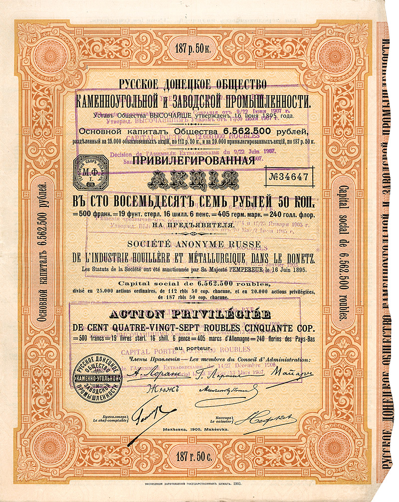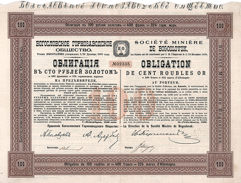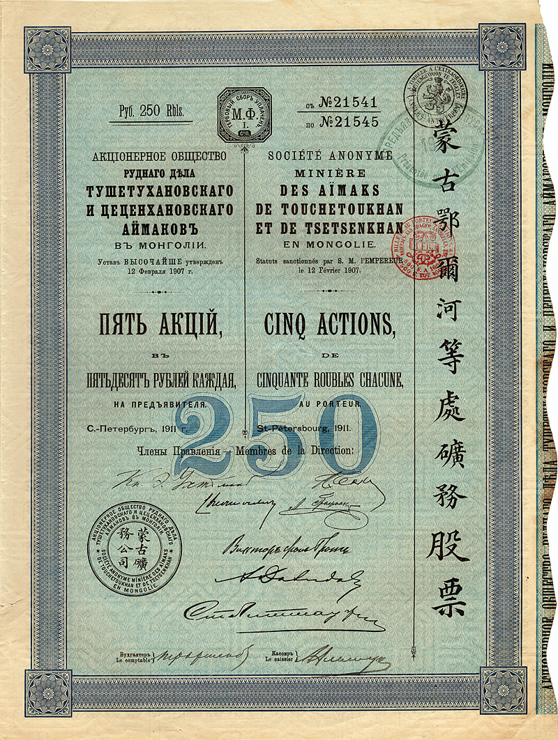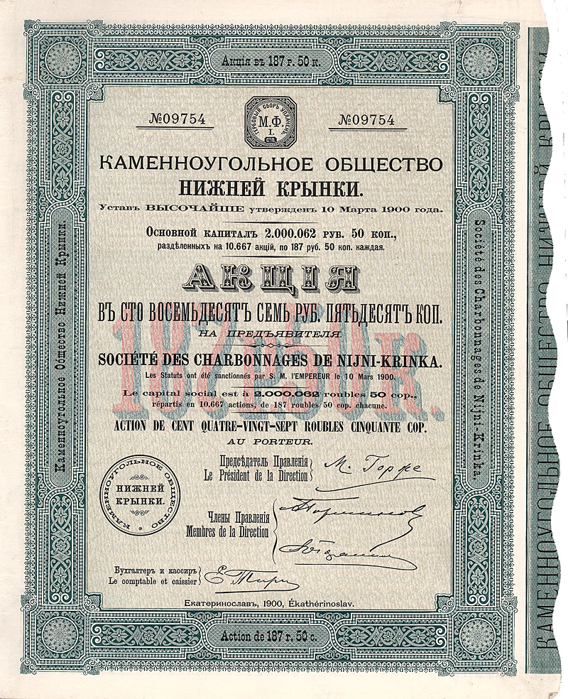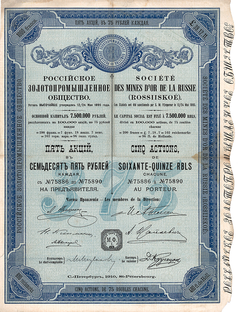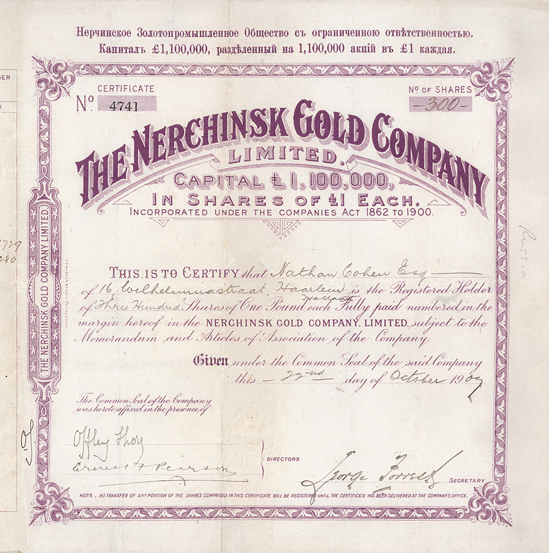 Нерчинское Золотопромышленное Обшество с ограниченной ответвствеенности. Die Gesellschaft wurde am 28.8.1901 in London gegründet, und erhielt die Genehmigung zur Tätigkeit in Russland am 3.10.1902. Die Ges. schürfte im östlichen Teil des zum Baikalgebiet gehörigen Landkreises Nerchinsk, und zwar im Einzugsgebiet der Flüsse “Schwarze Uruma”, “Gorbiza”, und “Zheltuga”, nach Gold. Die Rechte, in diesem Gebiet nach Gold zu schürfen besaß der russische erbliche Ehrenbürger N. A Perschin. Dieser stammte aus Blagoweschtschenks. Perschin hatte zuvor selbst versucht, Gold zu fördern, war dabei aber um 1900 in die Insolvenz geraten, so daß Perschin mit Erleichterung die Chance wahrnahm, dem britischen Geschäftsmann Lord Denmor die ihm gehörigen Recht im Rahmen einer Konzession für 24 Jahre zu übertragen. Die von Lord Denmor danach mit englischem Kapital ins Leben gerufene Aktiengesellschaft baute die Goldförderung in Nertschinsk auf. Die Verwaltung der englischen Ges. in Russland hielten die St. Petersburger Advokaten und Staatsräte Viktor und Leo Dandré. Die Gesellschaft existiert noch heute unter gleichem Namen (Kurzbezeichnung “Nérchinsk-zóloto”) und ist mit einer Hauptverwaltung in Tschita und einer Verwaltungsfiliale in Nertschinsk ansässig. Sie fördert Gold, Silber und Metalle der Platingruppe. Aktientext englisch, Originalsignaturen. Angaben zu Kapital der Ges. am oberen Rand auch in russisch. Firmenemblem im Blindprägestempel. Zertifikat ausgestellt auf Nathan Cohen Esq., 16 Wilhelmiastraat, Haarlem, Holland. Maße: 28,2 x 33,8 cm. Knickfalten, sonst tadellose Erhaltung.