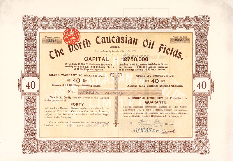 Северно-Кавказское нефтепромышленное обшество с ограниченной ответственности. Gründung am 29.1.1901 zwecks Übernahme und Betrieb der Ölfelder in Grosnyj, Tschetschenien. Die Gesellschaft wurde kontrolliert von der Anglo-Saxon Petroleum Co., die über die Aktienmehrheit verfügte. Kein Geringerer als Sir Henri Wilhelm August Deterding (1866-1939), der berühmte Erdölmagnat, Gründer der Royal Dutch/Shell-Gruppe, war Strippenzieher sowohl bei der North Caucasian Oil Fields als auch bei der Anglo-Saxon Petroleum Co.: beide Gesellschaften wurden schließlich seiner Shell Transport & Trading Co. einverleibt. Ein Stück aus der Kapitalerhöhung von 750.000 £ auf 1 Mio. £. Großformatig. Zweisprachig englisch/französisch. Es ist nicht geklärt, wie es dazu kam, dass das hier vorliegende Papier im Jahr 1926, also zu Zeiten der UDSSR ausgegeben wurde. Denkbar ist, dass die ursprünglichen Aktionäre eine Konzession von der Sowjetregierung erworben hatten, um an der ursprünglichen Stätte ihres Wirkens erneut tätig zu werden und Öl zu fördern. Maße: 26,9 x 40 cm. Mit anhängenden restlichen Kupons.