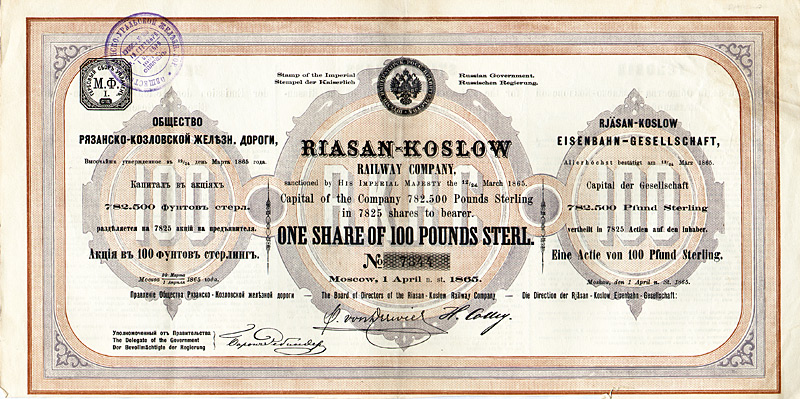 Gründung 1872. Zu den wichtigsten Gründern, die Anfang der 1870er Jahre die ersten Agrarbanken bzw. Hypothekenbanken initiierten, zählten die in Moskau und Odessa ansässigen deutschen, deutsch-jüdischen und griechischen privaten Bankhäuser, wie z.B. Meyer & Co., I.E. Ginzburg, L.M. Rosenthal, M. Effrussi & Co., I. Skaramanga und die Gebrüder Solomon und Lasar Poljakow. Aktientext russisch, Firmenname auch deutsch/französisch, die rückseitigen Statuten russisch/deutsch. Dekorative Gestaltung im Historismus-Stil. Lasar Poljakow und sein Sohn Isaak haben auf der vorliegenden Aktie die ersten beiden Unterschriften geleistet. Die dritte Unterschrift auf der Aktie ist die des Mitgründers, Fürst Nikolai S. Schtscherbatow. Maße: 21,9 x 27 cm. Extrem seltene Emision!