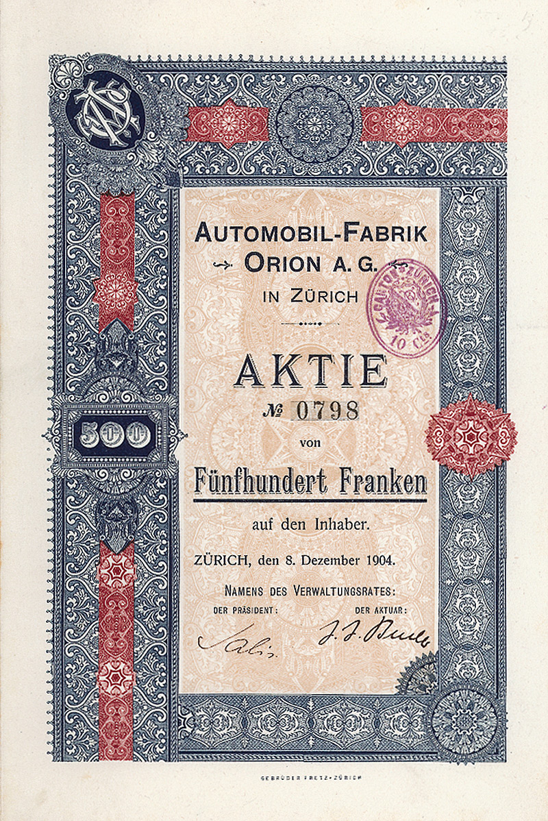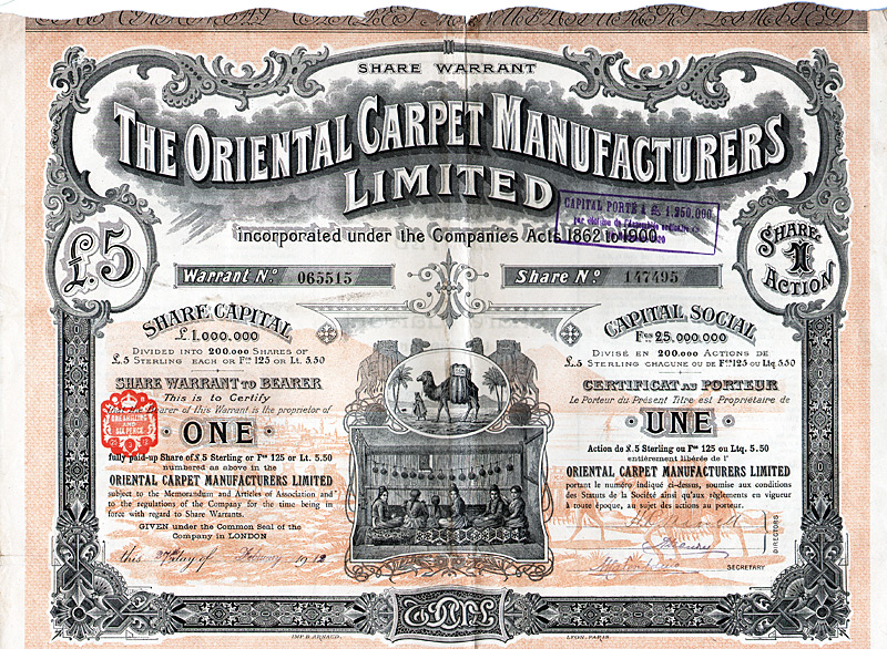 Eines der bedeutendsten Unternehmen des Osmanischen Reiches, nur von den Eisenbahngesellschaften an Grösse übertroffen. Gegründet am 16.12.1907 von sechs englischen Kaufleuten mit einem Kapital von 400.000 £. Die Webstühle und die technische Einrichtung der Teppichmanufakturen wurden aus Deutschland und Österreich importiert. Innerhalb kürzester Zeit baute die Gesellschaft sechs Teppichfabriken in den Städten Simav, Gördes, Demirci und Kula auf. Wenige Jahre später wurden bereits in 11 eigenen Fabriken die Teppiche geknüpft. Von den 60000 anatolischen Teppichknüpfern standen 25 % auf den Lohnlisten der Oriental Carpet Manufacturers. Die Gesellschaft entwickelte sich äußerst positiv, die Dividendenzahlungen stiegen von 1908 mit 8 % , 1909 auf 15 % und 1910 auf 20 %. Noch in den 60er Jahren wurden ihre Aktien an der Londoner Börse gehandelt. Ein hochdekorativer Textilwert mit ganzflächigen orientalischen Szenen im Unterdruck, außerdem Kamele mit Teppichen beladen und Blick in die Werkstatt mit jungen Frauen beim Teppichknüpfen. Maße: 28,9 x 40,2 cm. Rückseitig Bedingungen. Originalsignaturen. Mit anhängendem restlichen Kuponbogen (Talon + 1 Kupon).