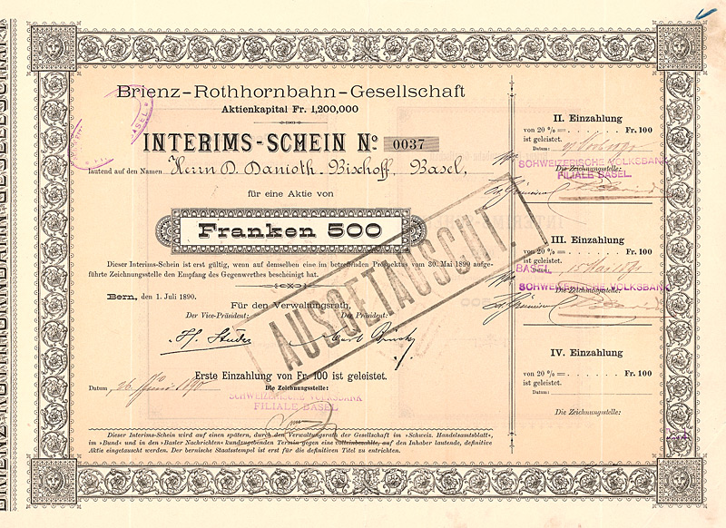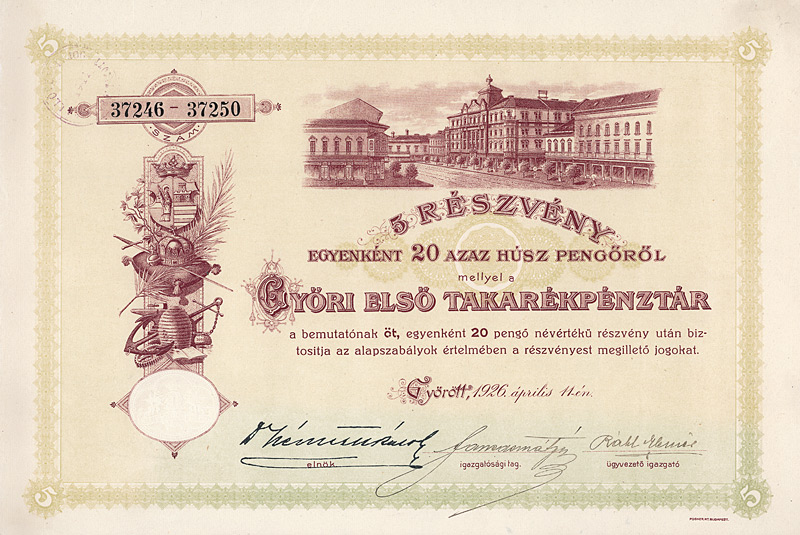 Gründung der Sparkasse bereits 1844 in Györ (deutsch: Raab), seit 1994 Standort des Motorenwerkes der Audi AG. Hochdekorative mit Zierleiste links und miitig oben das Bankgebäude. Maße: 24,2 x 36,3 cm. Doppelblatt, mit Kupons.