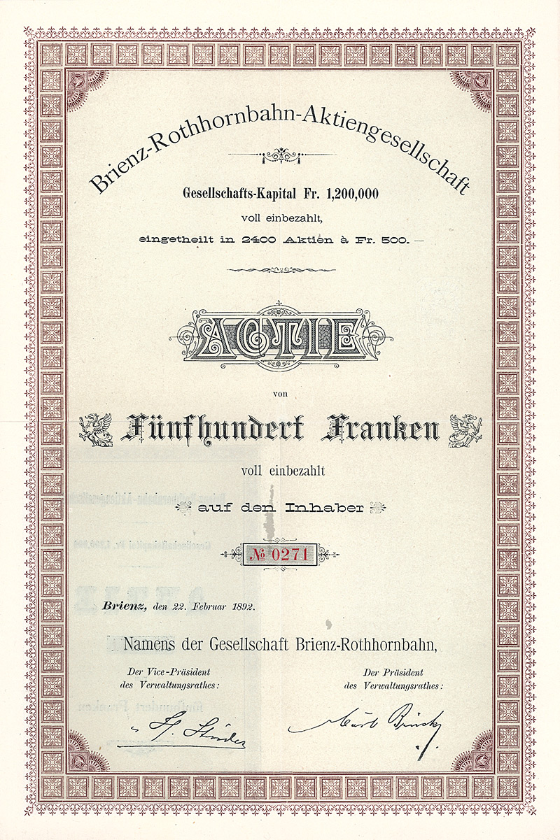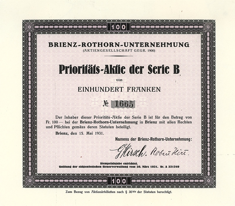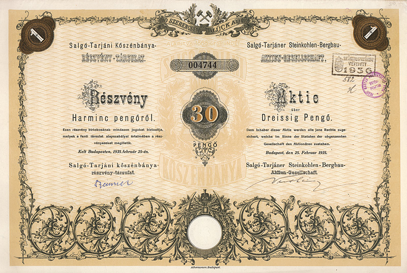 Gründung 1868. Hervorgegangen aus der k.k.priv. ungar. Nordbahngesellschaft, die 1868 aufgelöst wurde und sich als Salgó-Tarjáner Steinkohlen-Bergbau AG rekonstituierte. Börsennotiz Budapest und Wien. Die Gesellschaft ist eine der ältesten und seit der Fusion 1925 mit der Gran-Szászvárer Kohlenbergbau AG, der Nordungarischen Vereinigten Kohlenbergbau AG, der Graner Regional Kohlenbergbau AG und der Hungaria Kalkindustrie AG auch eine der größten ungarischen Industrieunternehmen. Besitz von umfangreichen Braunkohlenfeldern sowie Grundbesitz, Brikettfabriken, Kalksteinbrüche, Ziegel- und Zementfabriken und zahlreiche Beteiligungen. Großformatiges Papier, äußerst dekorativ, zweisprachig ungarisch/deutsch, inwendig auch in französisch und englisch. Originalsignaturen. Maße: 25 x 37,3 cm. Doppelblatt, mit restlichem Kuponbogen.