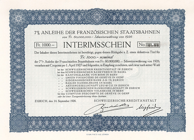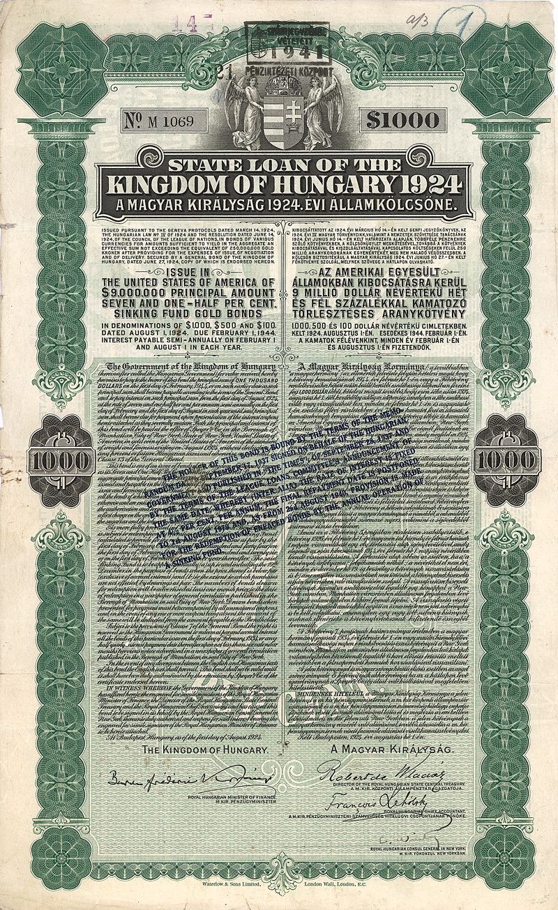 Die sog. Genfer Anleihe, da gemäß dem Genfer Protokoll im Rahmen des Völkerbundes aufgenommen. Zweisprachig englisch/ungarisch, rückseitig Bedingungen. Maße: 42,4 x 26,3 cm. Rückseitig mit Stempel: „Interest due August 1st. 1944 paid“. Nicht entwertet!