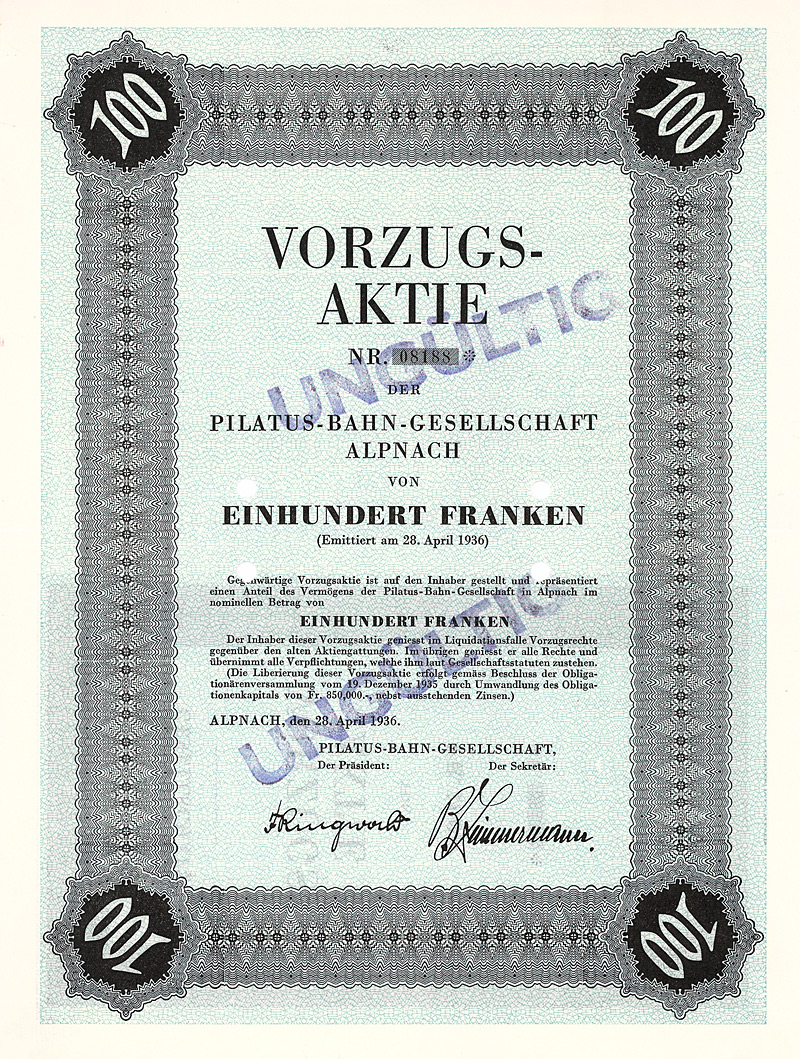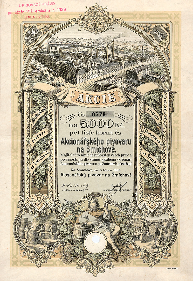 Auflage 12.000. Die 1869 gegründete Brauerei produziert das bis heute berühmte (und zwischendurch vor allem von DDR-Bürgern hochgeschätzte) Staropramen-Bier. Der Betrieb auf einem 5 1/2 ha großen Gelände in Smíchov (damals noch selbständige Stadt am linken Ufer der Moldau gegenüber von Prag gelegen und mit Prag durch die Palackybrücke verbunden, heute ein Stadtteil von Prag) wurde ständig erweitert, 1911 baute die Brauerei sogar ein eigenes Kraftwerk. Vor Beginn des 2. Weltkrieges war die Brauerei mit einer Erzeugungskapazität von 1 Mio. hl im Jahr eine der größten in Europa. Genauso rekordverdächtig waren die Gewinne: Seit der Jahrhundertwende wurden jahrzehntelang Dividenden um die 75 % gezahlt! Entsprechend hoch waren die Kurse der erst in Wien, nach Entstehen des tschechoslovakischen Staates im Exotenverkehr Prag börsennotierten Gesellschaft. Außergewöhnlich dekorative, mehrfarbige Gestaltung mit Gambrinus, Arbeitern beim Abfüllen von Bier in Fässer und bei der Faßverladung auf pferdebespannten Brauereiwagen, große Ansicht der Brauerei aus der Vogelperspektive mit Silhouette der Stadt Prag im Hintergrund. Maße: 34,5 x 24 cm. Doppelblatt, mit Kupons. Prägesiegel lochentwertet.
