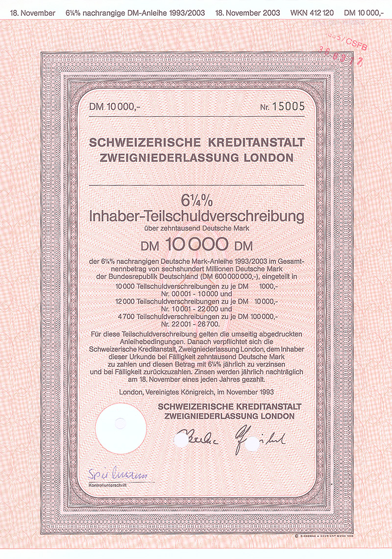 Entstanden 1920 (unter Führung der Mailänder Banca Commerciale Italiana) durch Fusion des Creditinstitutes ungarischer Holzhändler mit der Ungarischen Landesbank, 1925 wurde zusätzlich die Ungarische Agrar- und Rentenbank AG aufgenommen. Wegen der guten Auslandsbeziehungen refinanzierte die Bank ihr Hypotheken- und Kommunaldarlehnsgeschäft überwiegend in England und in den USA. Braun/schwarzer Stahlstich mit allegorischer Vignette. Maße: 39 x 25,5 cm. Mit anh. restlichen Kupons, lochentwertet. Nur 8 Stücke wurden Mitte der 90er Jahre in einem Prager Banktresor gefunden.
