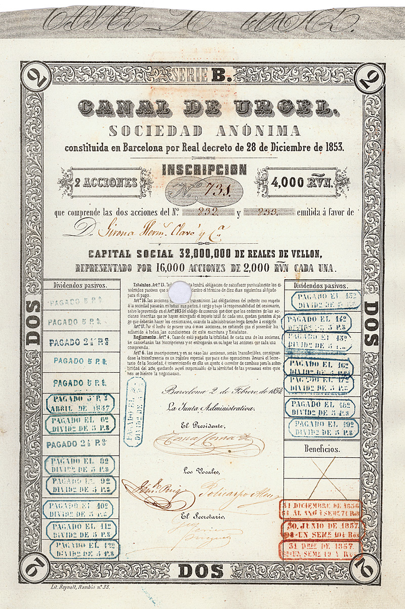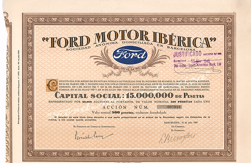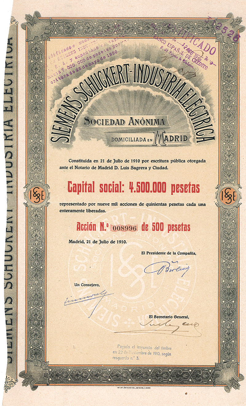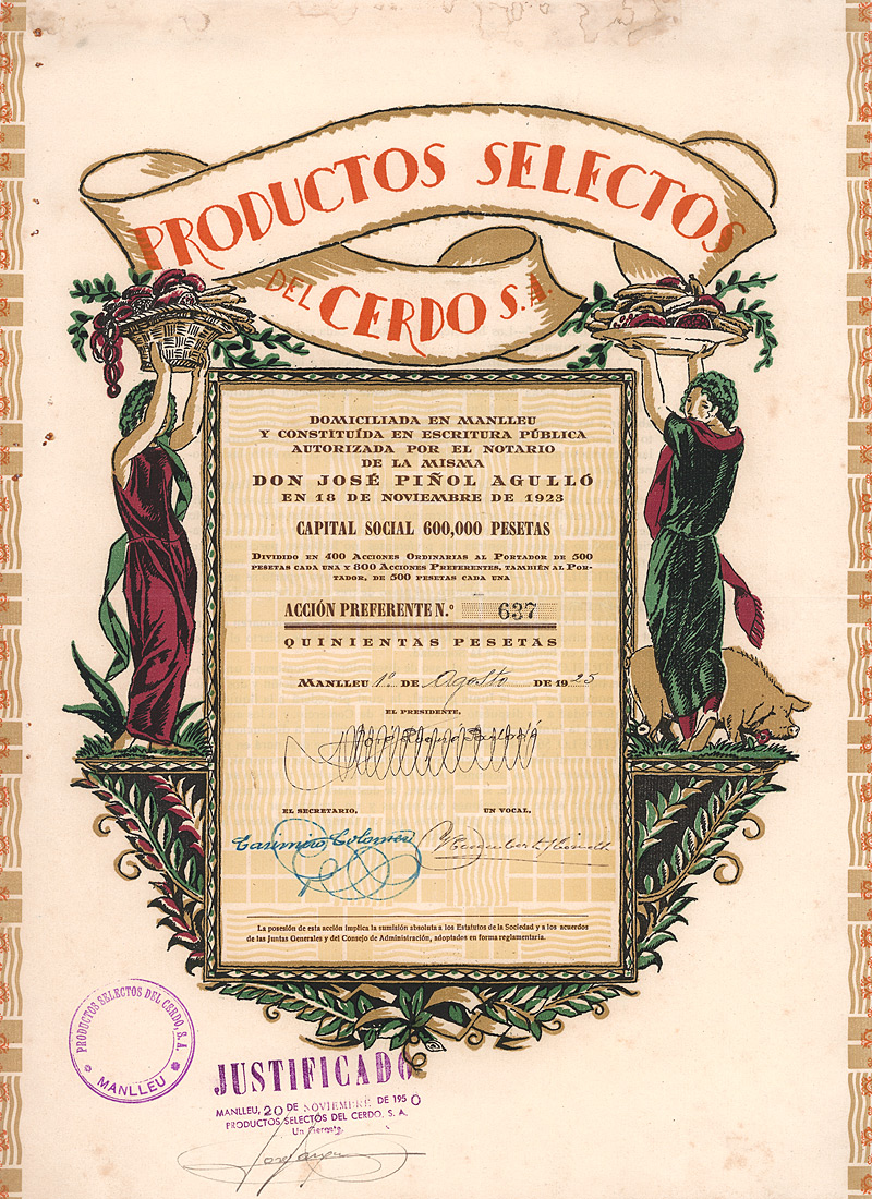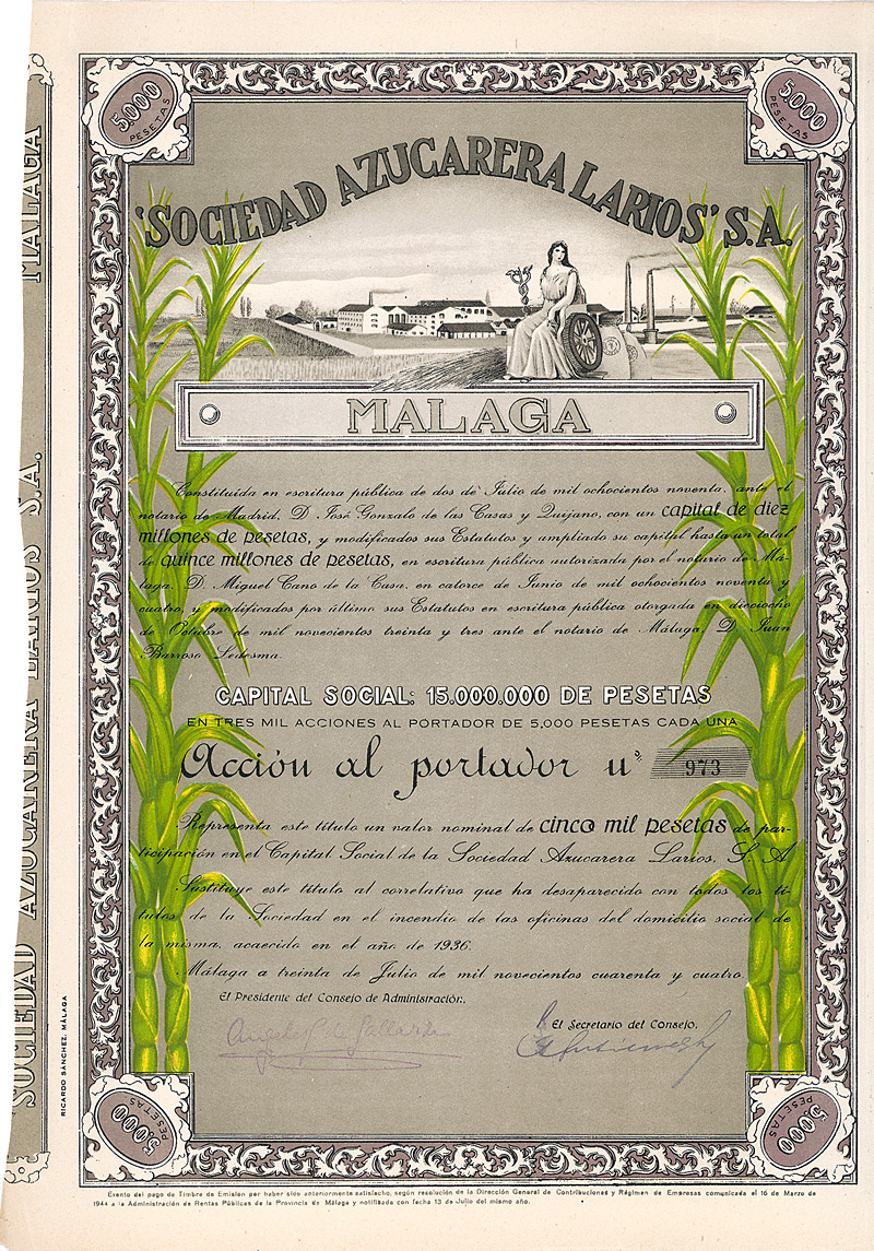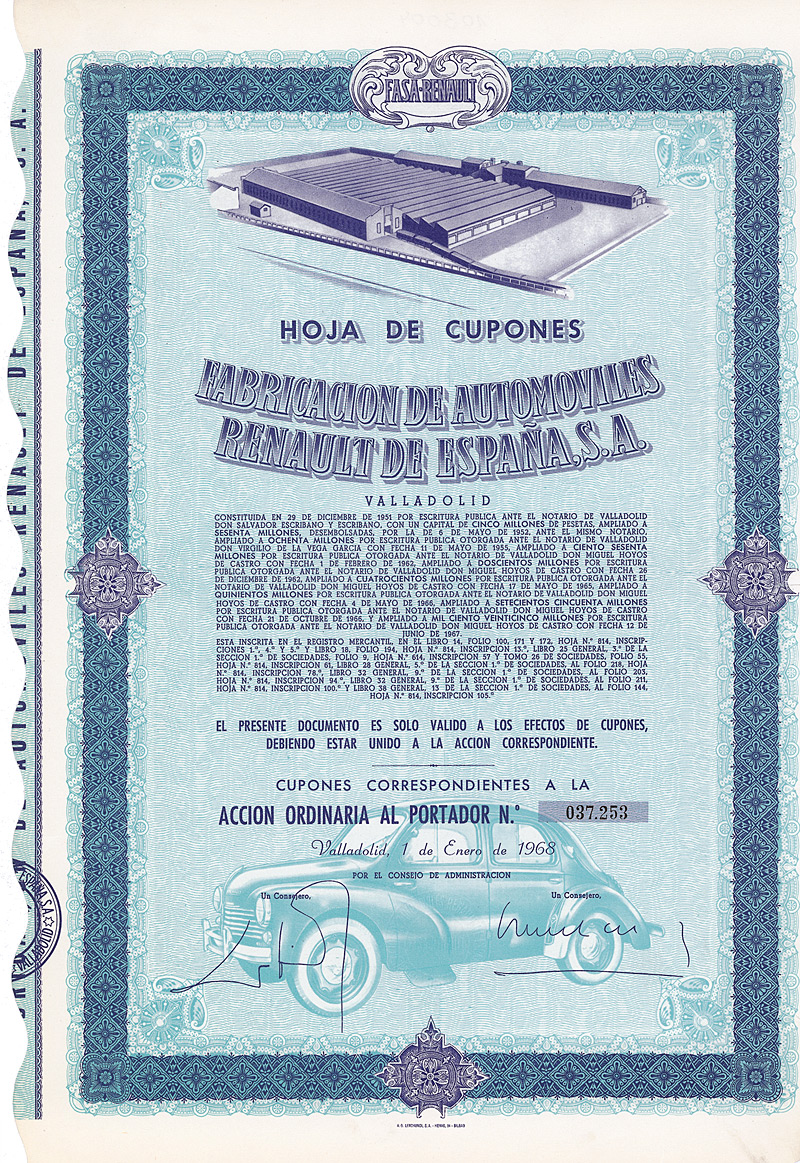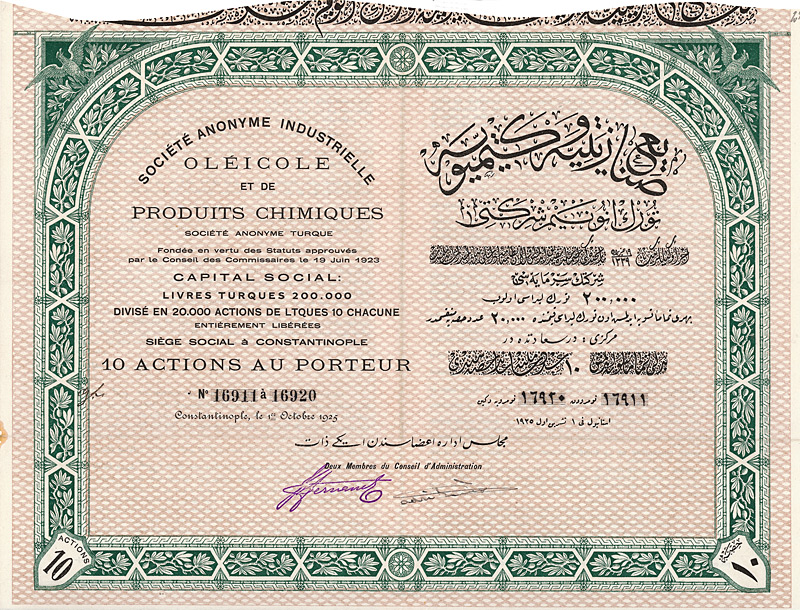 Gründeranteil, Auflage 2.000. D/H TR 1390a, R7. Gründung 1923, Handel mit Olivenöl, Herstellung von Seife und sonstigen chemischen Produkten. Großformatig und dekorativ, breite Umrahmung mit Adlern. Zweisprachig französisch/arabisch. Maße: 29,2 x 38,9 cm. Mit komplett anh. Kupons. Seit Jahren nicht mehr angebotenes Papier, sehr niedrig limitiert!