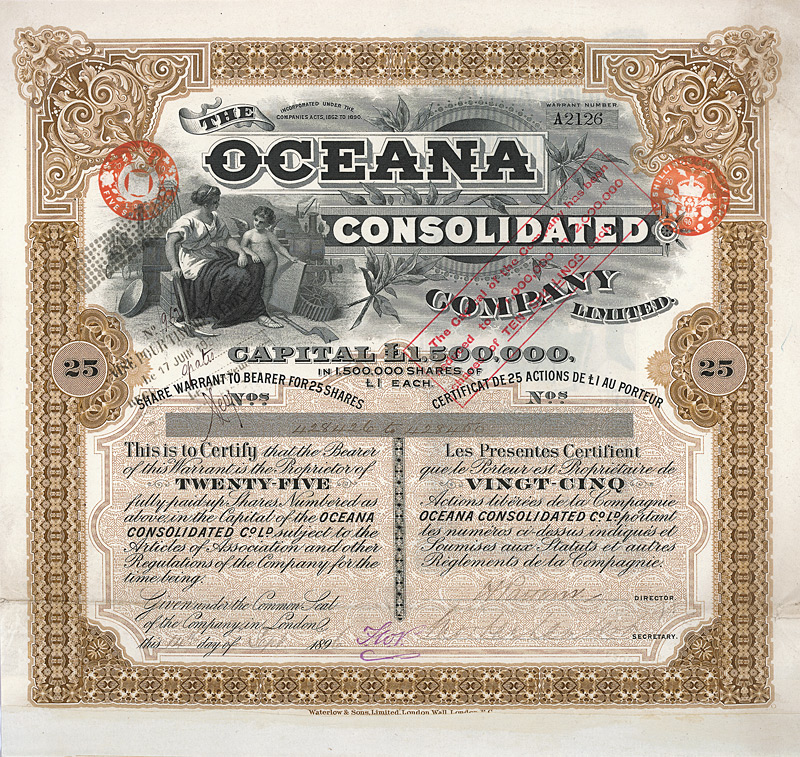 Gründung 1896 zur Übernahme der Besitzungen der Ocean Co. Ltd., Africana Ltd. und der Austral African Co. Ltd., deren Assets sich hauptsächlich aus Land- und Mineralressourcen im Transvaal zusammensetzten. Herrlicher Stahlstich von Waterlow & Sons mit Allegorie, Engel, Eisenbahn, Werkzeug. Zweisprachig englisch/französisch. Originalsignaturen. Maße: 29,1 x 31 cm. Mit anhängenden restlichen Kupons.
