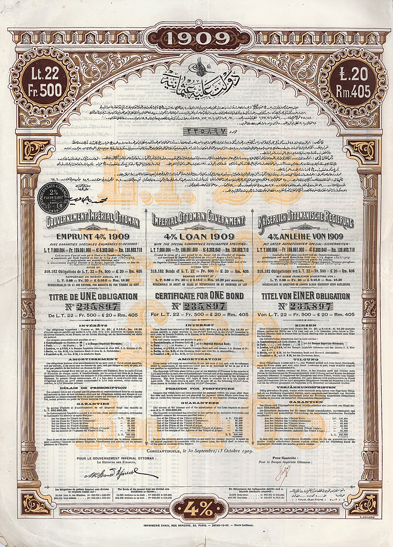 D/H TR 2560, R7. Die Anleihe war abgesichert auf verschiedenen Zehnten sowie der Hammelsteuer des Vilajet Aleppo. Viersprachig, auch in deutsch. Großformatig mit Säulenumrandung. Maße: 51 x 38 cm. Mit anhängenden restlichen Kupons ab 1927, nicht entwertet.