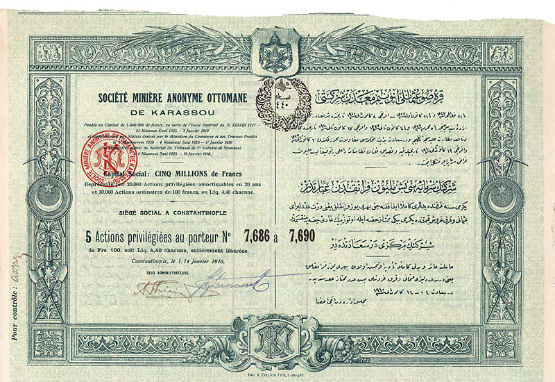Gründung 1892 zum Betrieb von Blei- und Zinkbergwerken. Es handelt sich um die Bergwerke im Großraum Izmit (in der Nähe von Istanbul), im Landeskreis Kandira in der Nähe der Ortschaft Karasu. Schöne Umrahmung mit Schaufeln und Hacken sowie 4 Vignetten mit Wappen und türkischen Halbmonden, Text zweisprachig französisch/osmanisch. Maße: 22 x 32,6 cm. Mit komplett anhängenden Kupons.