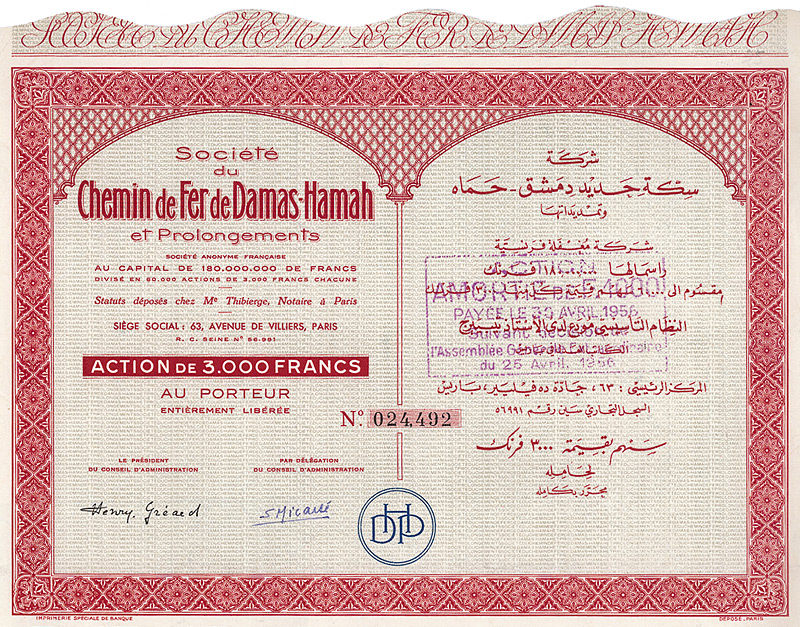 Auflage 60.000. Die 1892 aufgrund einer ottomanischen Konzession gegründete D.H.P. ging aus der Fusion der Société des Chemins de fer Ottomans economiques de Beyrouth-Damas-Hauran et Biredjik sur l’Euphrate mit einer belgischen Ges. hervor. Sie übernahm von ihrer Vorgängerin die von Damaskus ausgehende Hauranbahn und die Libanonbahn. Die Libanonbahn überquert das Libanongebirge und den Anti-Libanon. Sie ist 143 km lang. Als das Osmanische Reich die Hedschasbahn projektierte, versuchte es, die Hauranbahn aufzukaufen, was aber an den zu hohen Forderungen der D.H.P. scheiterte. So wurde die Hedschasbahn parallel verlegt und es gab zwischen Damaskus und Muzeirib bis zum Ersten Weltkrieg zwei Bahnen, die sich Konkurrenz machten. Die Hauranbahn wurde zu Beginn des Ersten Weltkriegs demontiert, um das Material für den Vortrieb der Eisenbahn in Palästina, in Richtung des anzugreifenden Suezkanals, zweitzuverwenden. Die für die D.H.P. namensgebende Strecke von Damaskus nach Hama gab es in dieser Form gar nicht. Die durchgehende Verbindung Rayak-Aleppo konnte ab 1906 befahren werden. In Aleppo bestand ab 1915 Anschluss an die Bagdadbahn. 1911 errichtete die D.H.P eine Strecke von Tripoli nach Homs. Deren östlicher Teil wird heute noch teilweise von der Verbindung Homs - Tartus der Syrischen Eisenbahn genutzt. Die Abzweigung in Richtung Libanon erfolgte im Bahnhof Aakkar. Zu Beginn des Ersten Weltkriegs wurden alle ausländischen Bahnen im Eigentum von Gesellschaften, die ihren Sitz im nun feindlichen Ausland hatten, beschlagnahmt, also auch die Bahnen der D.H.P. 1956 verstaatlichte Syrien seine Eisenbahnen. Die D.H.P. ging in der Chemins de Fer Syriens (CFS) auf. Zweisprachig französisch/osmanisch. Amortisationsstempel von 1956. Maße: 21,8 x 27 cm. Mit anhängenden restlichen Kupons.